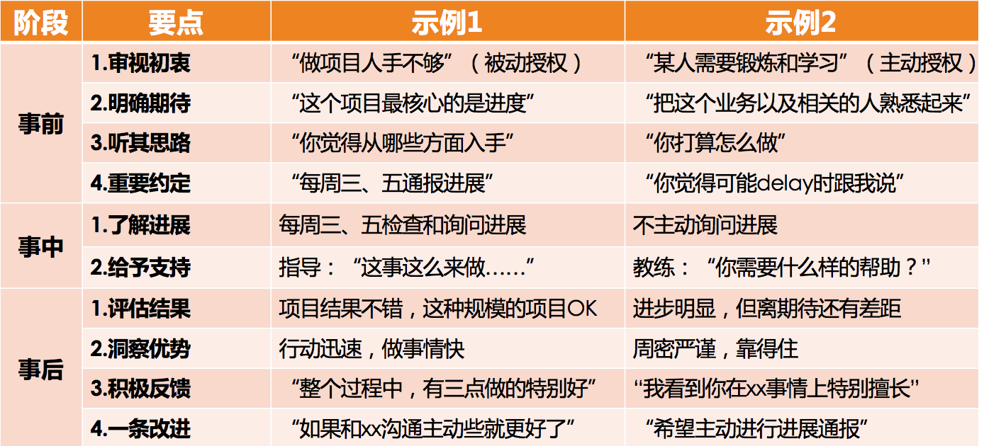 工作授权,并不只是用于人才培养,还可能是因为自己应接不暇时,迫不得已把一些工作授权给员工来做,这种授权以交付结果为核心目的,姑且叫做“被动授权”,不是今天的话题。今天我们探讨的是用于培养人才的“主动授权”,也就是图表中的“示例 2”。你可能会发现我用的是“示例”这个字眼,而且其中有很多带引号的描述,就表示这不是一个标准的做法,而只是按照左侧的“要点”举的例子,只是为了方便你理解这些“要点”的。