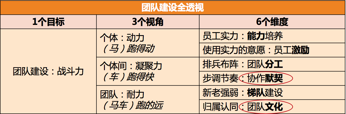 期待过高是初衷不清晰的另一个表现,即,希望通过一次或几次团建就能打造出有凝聚力、有战斗力的团队,这种想法是很魔幻的。如果你还记得我前面介绍过的“团队建设六要素”,就不难发现,团建活动能影响到的要素,也就是其中的 1.5 个:这 1 个是指“协作默契”,0.5 个是指“团队文化”。