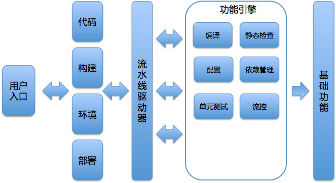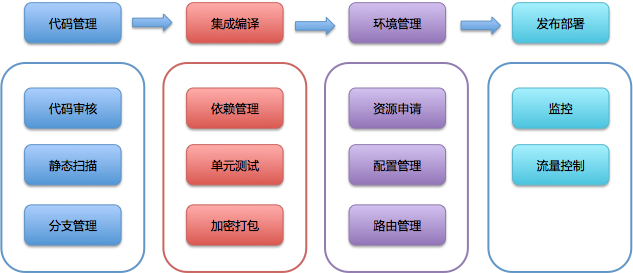 持续交付平台最终将完成这个端到端的过程,那么流水线的每一步都可以认为是一个模块。由此,整个平台的核心模块就是:代码管理、集成编译、环境管理、发布部署。