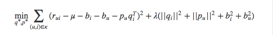 \[ \\min_{q^{\* },p^{\* } } \\sum_{(u,i) \\in \\kappa }{(r_{ui} - p_{u}q_{i}^{T})^{2} + \\lambda (||q_{i}||^{2} + ||p_{u}||^{2})} \]