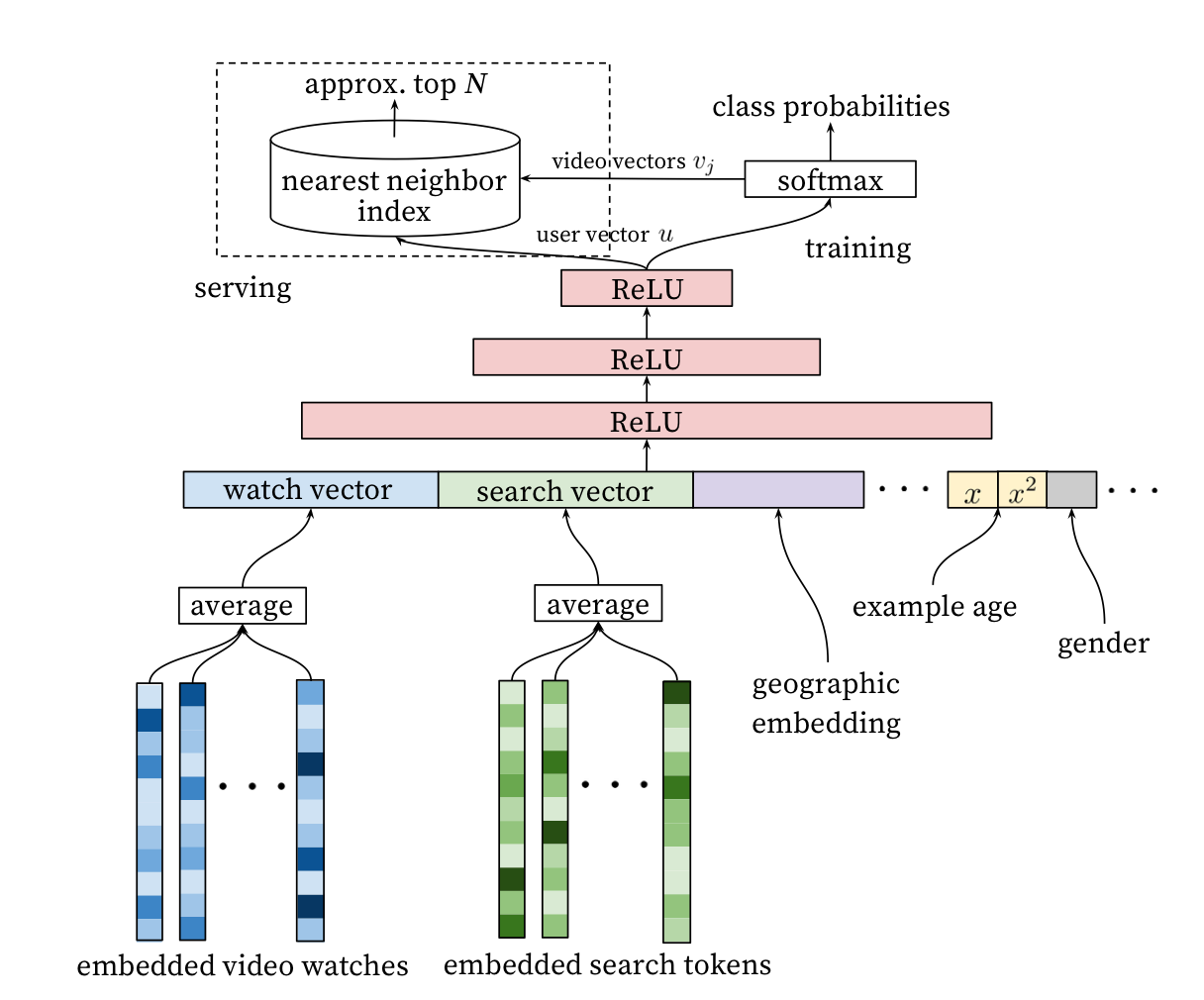 在模型训练时,以Softmax作为输出层,但是在实际线上预测服务时,由于模型关心相对顺序,所以并不需要真的去计算Softmax,而是拿着用户的特征向量做近似的近邻搜索,只生成最相近的一些推荐结果。