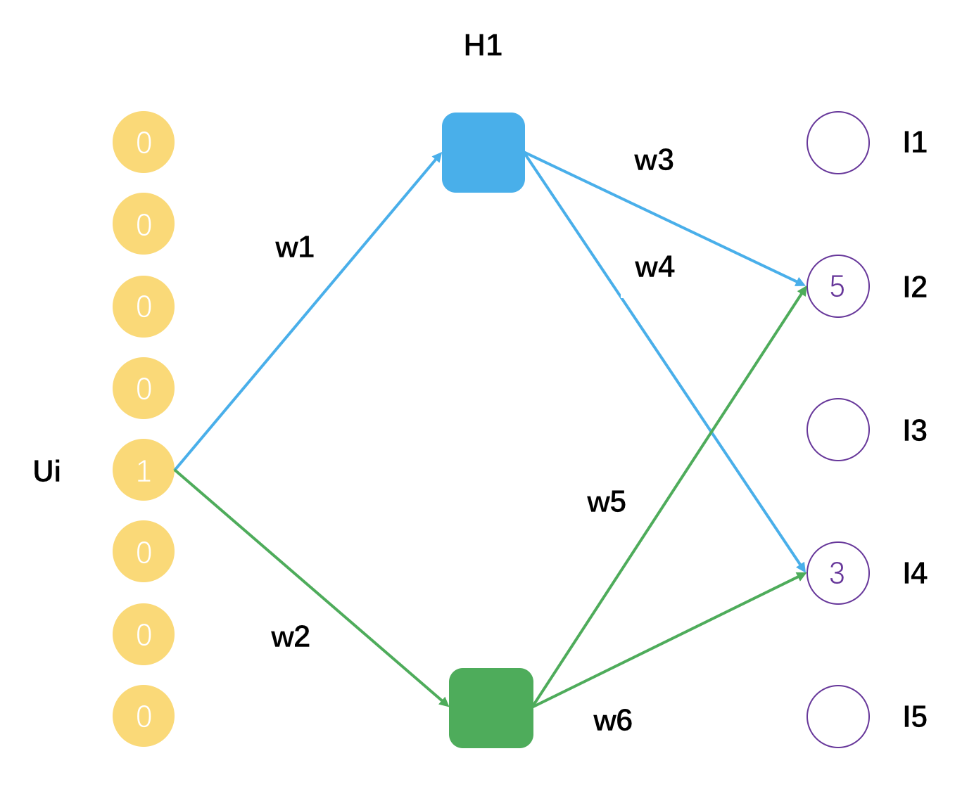 这个示意图表示了一个用户Ui,评分过的物品有I2和I4,分解后的矩阵隐因子数量是2,用户Ui的隐因子向量就是[w1, w2],物品I2的隐因子向量是[w3, w5],物品I4的隐因子向量是[w4, w6]。
