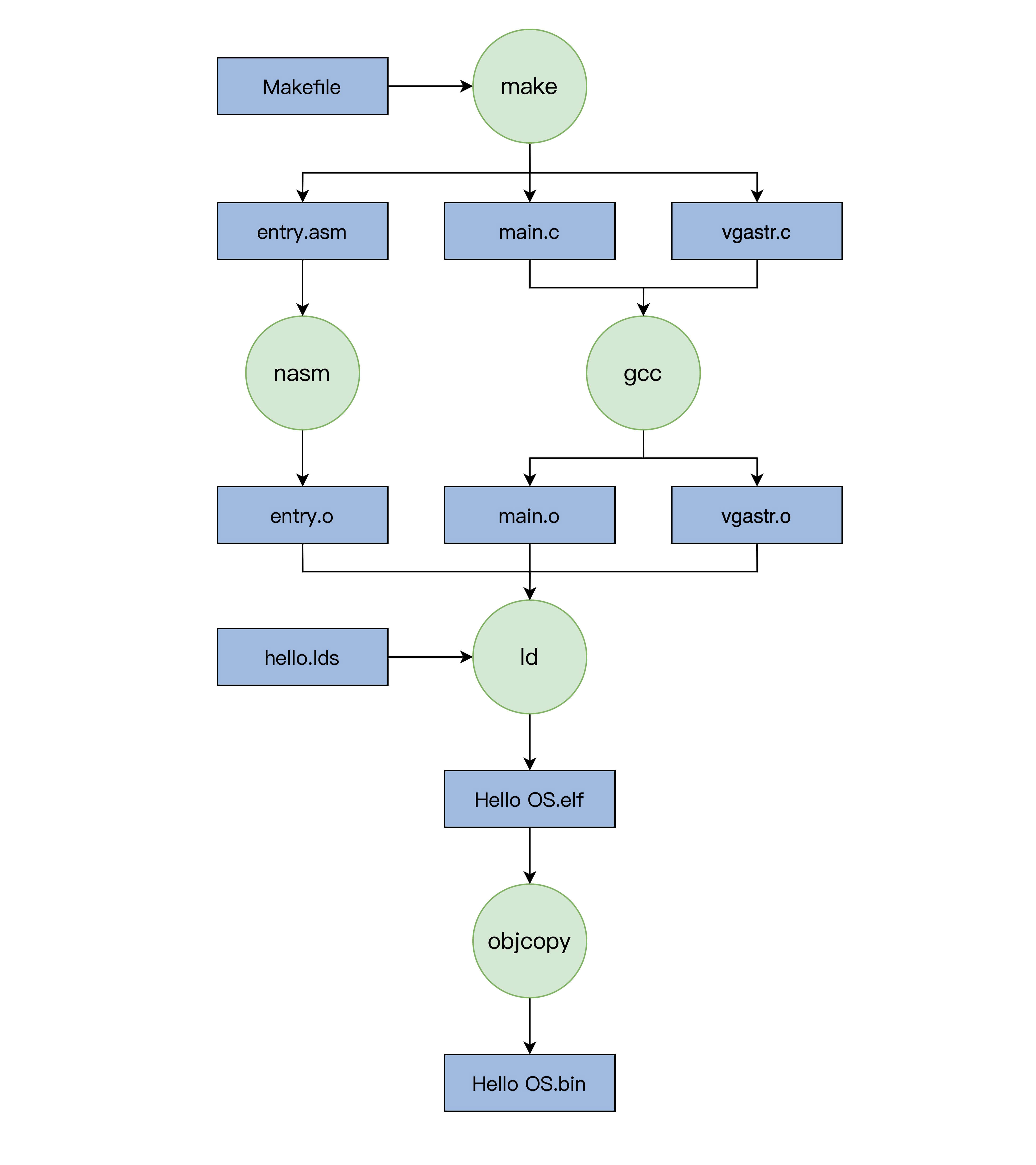 下面我们用一张图来描述我们Hello OS的编译过程,如下所示: