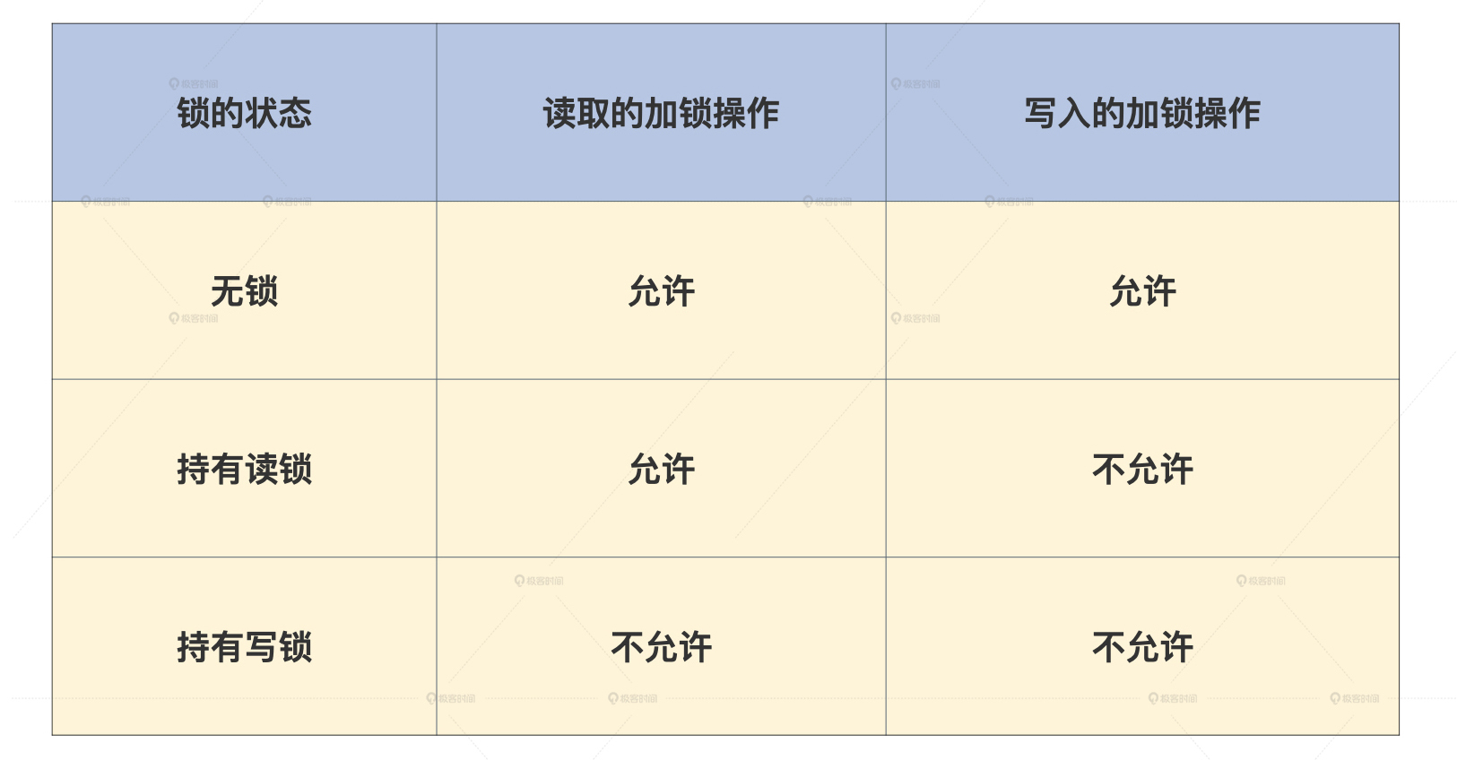 1.当共享数据没有锁的时候,读取的加锁操作和写入的加锁操作都可以满足。- 2.当共享数据有读锁的时候,所有的读取加锁操作都可以满足,写入的加锁操作不能满足,读写是互斥的。- 3.当共享数据有写锁的时候,所有的读取的加锁操作都不能满足,所有的写入的加锁操作也不能满足,读与写之间是互斥的,写与写之间也是互斥的。