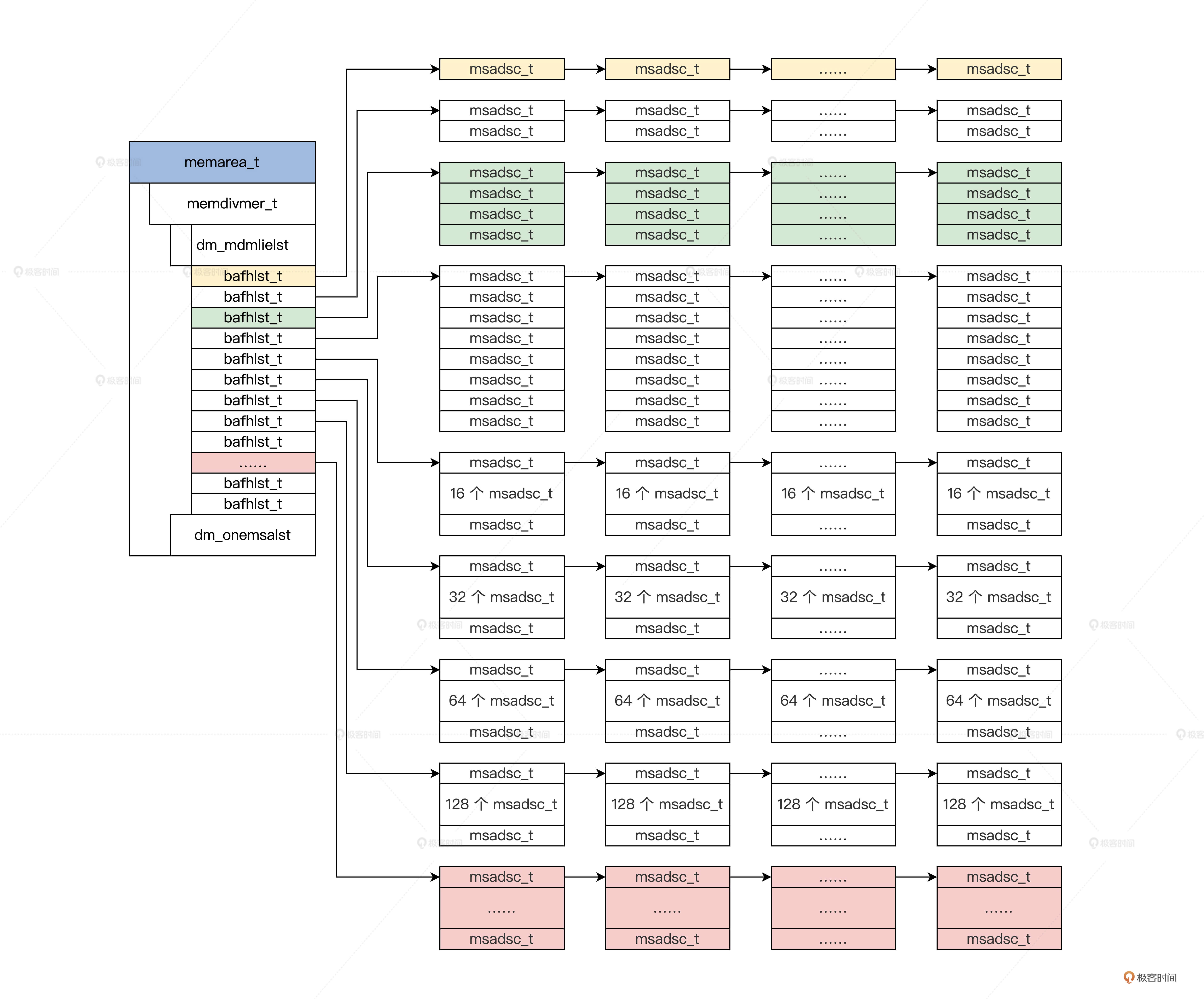 每个memarea_t结构表示一个内存区,memarea_t结构中包含一个内存分割合并memdivmer_t结构,而在memdivmer_t结构中又包含了bafhlst_t结构类型dm_mdmlielst数组。在dm_mdmlielst数组中挂载了多个msadsc_t结构。