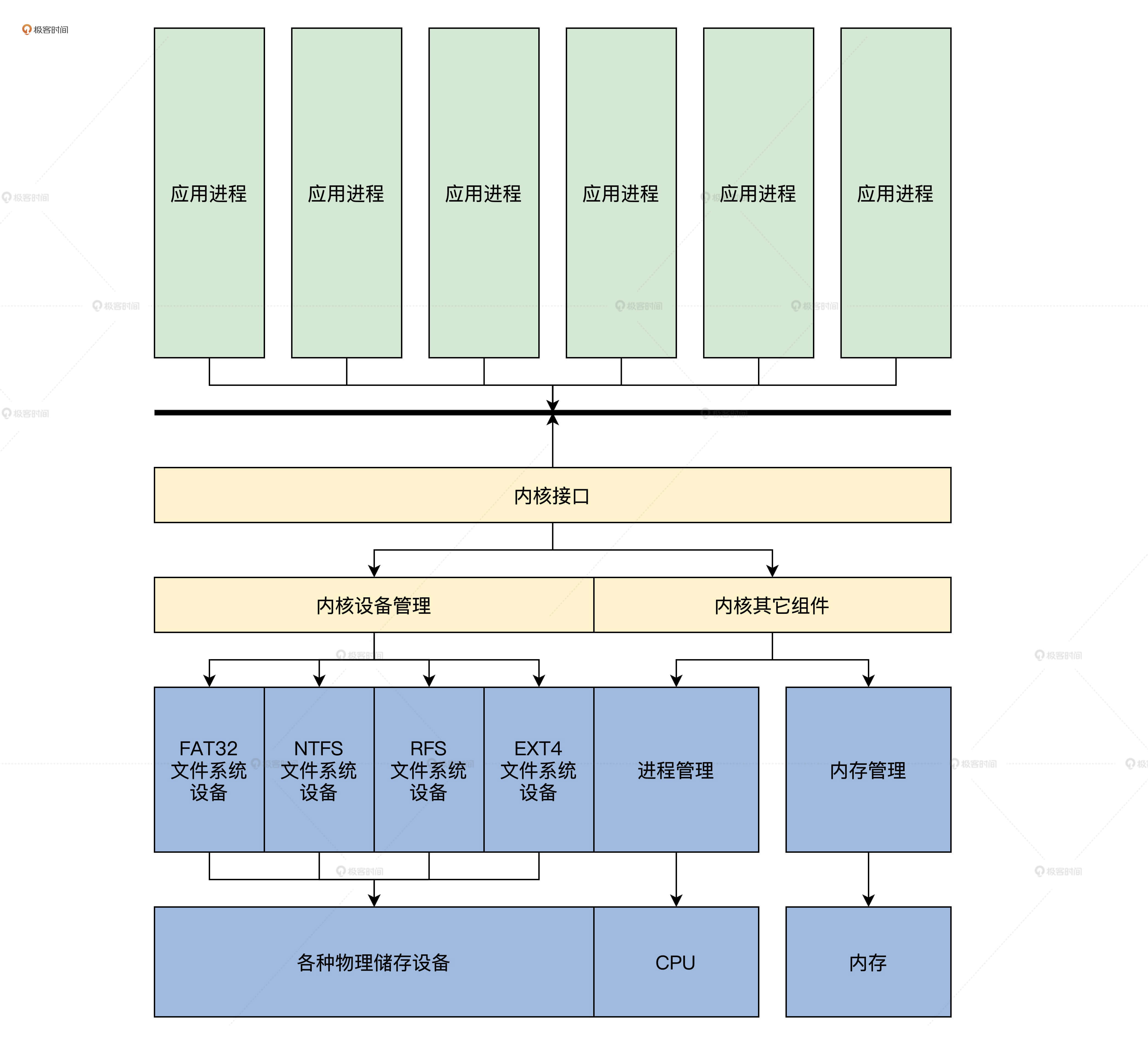 这里我不仅给出了文件系统设备的架构,还简单地梳理了内核中其它组件与文件系统的关系。