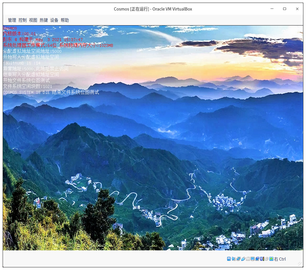 test_rfs_bitmap函数我们已经写好了,别忘了在rfs_entry函数的末尾调用它,随后我们在终端下执行make vboxtest,就可以看到Cosmos加载rfs驱动程序运行后的结果,如下所示。