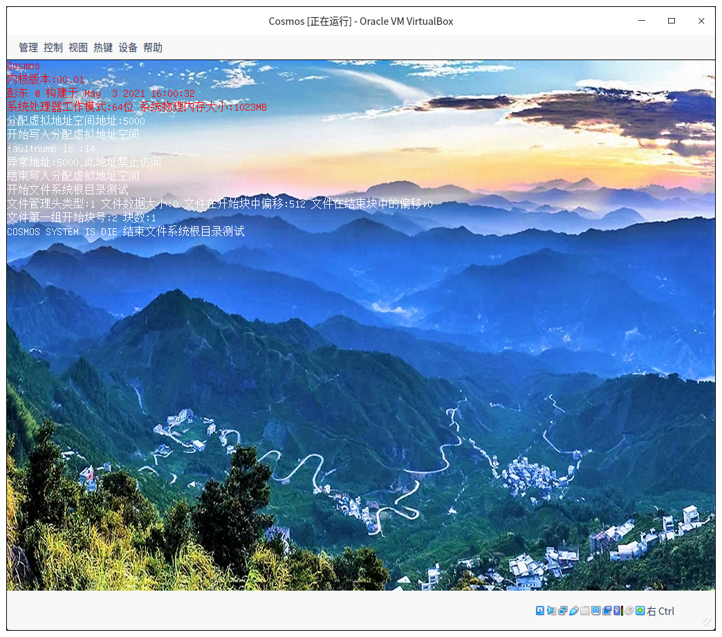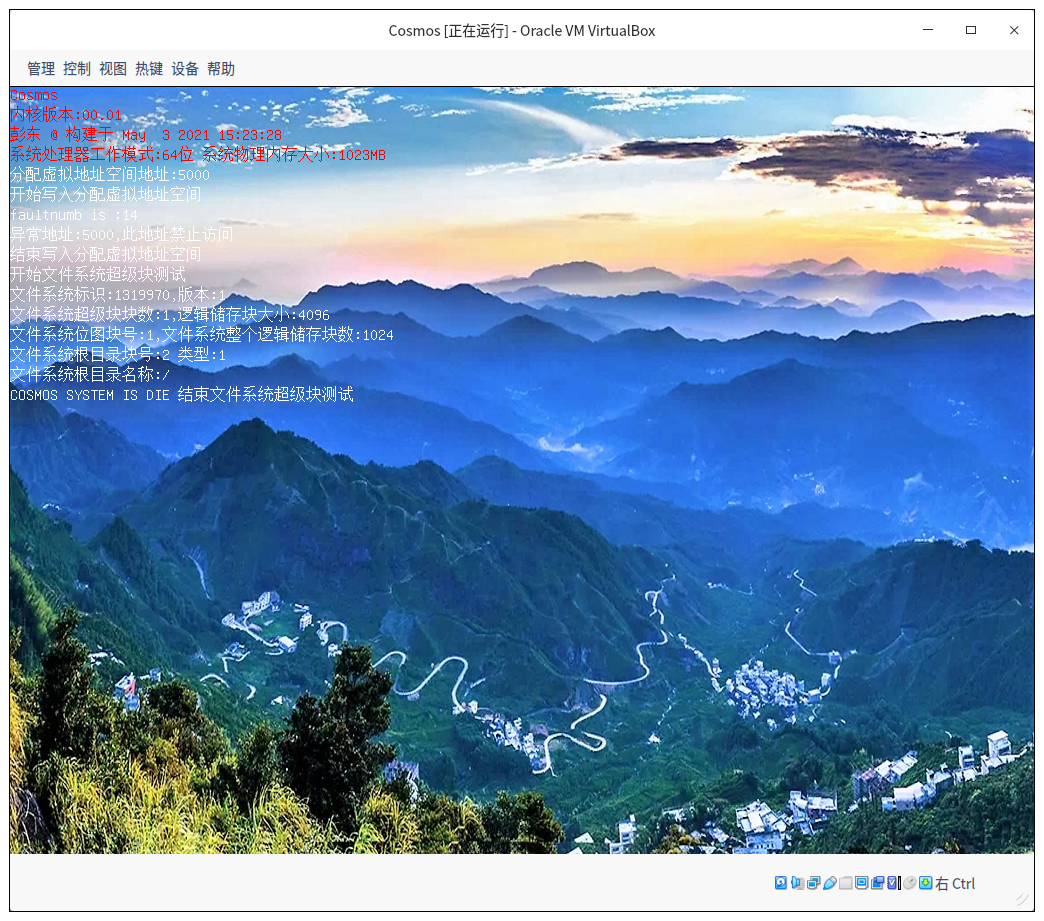 测试代码我们已经写好了,下面我们打开终端,切换到Cosmos目录下执行make vboxtest,Cosmos加载rfs驱动程序运行后的结果,如下所示。