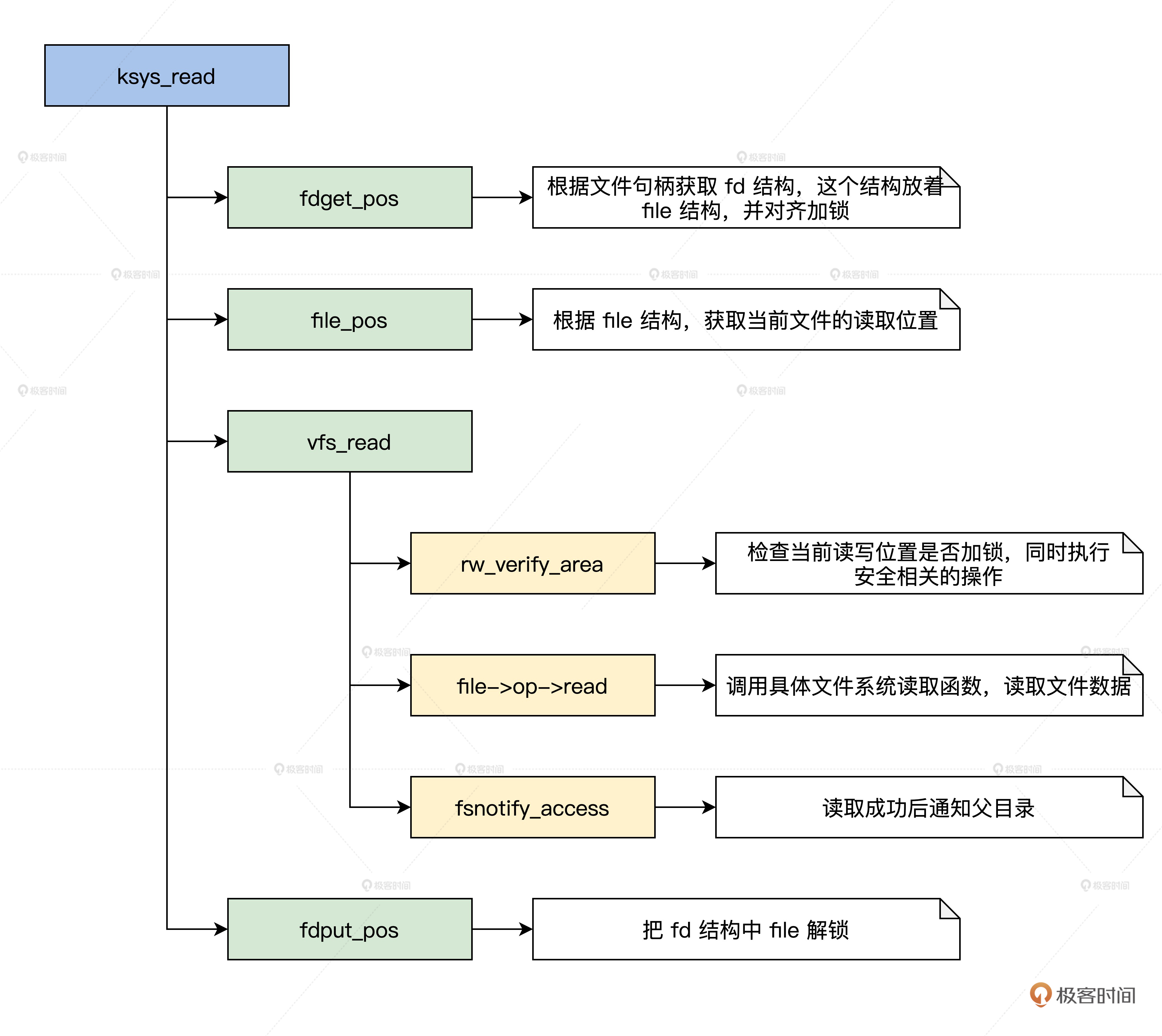 上图中展示了读文件操作的函数调用流程,写文件操作的流程和读文件操作的流程一样,只是数据流向不同,我就不展开了,你可以自己想一下。