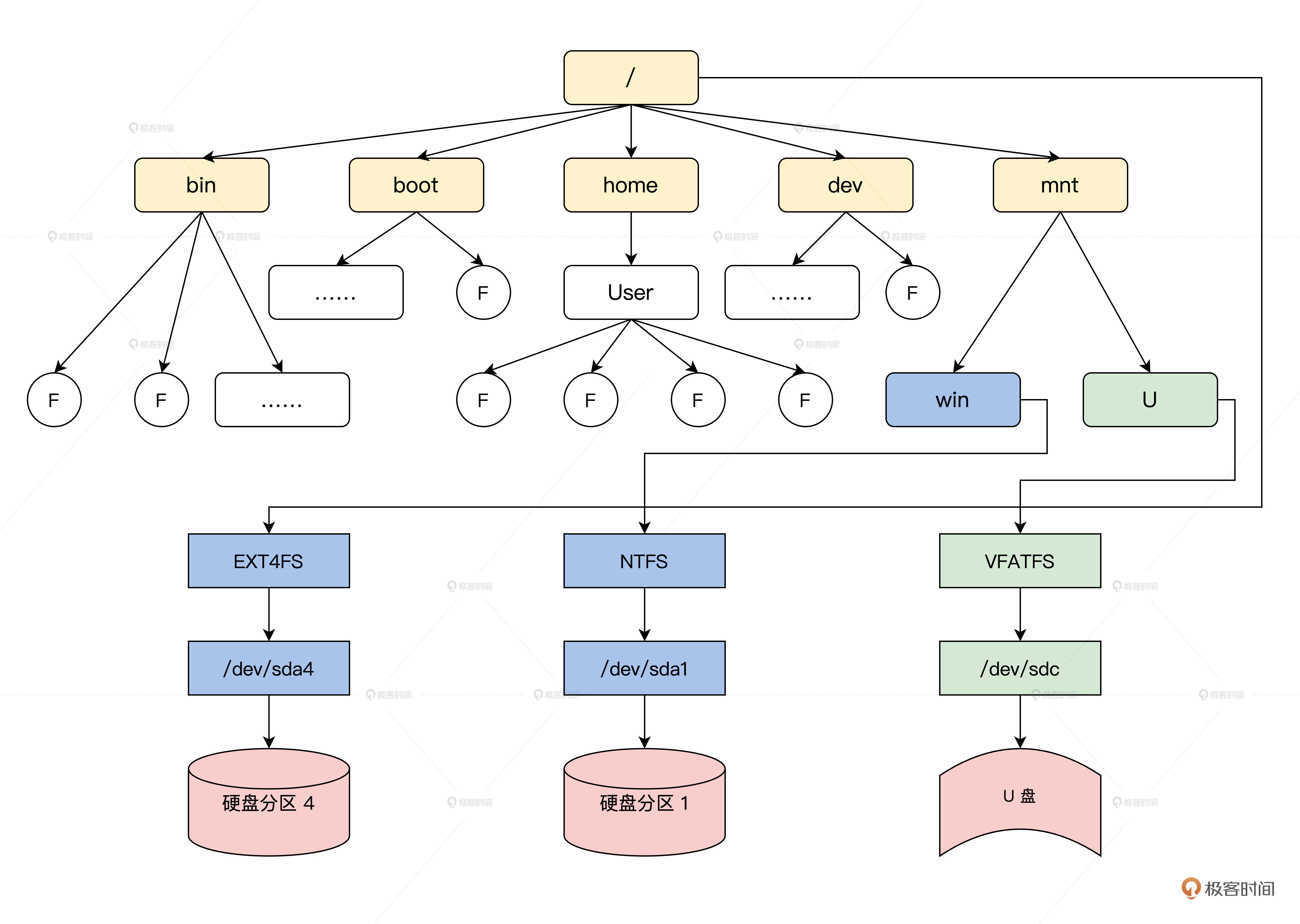 Linux系统中所有文件都是用目录组织的,就连具体的文件系统也是挂载到某个目录下的。Linux系统的目录结构逻辑示意图,如下所示。