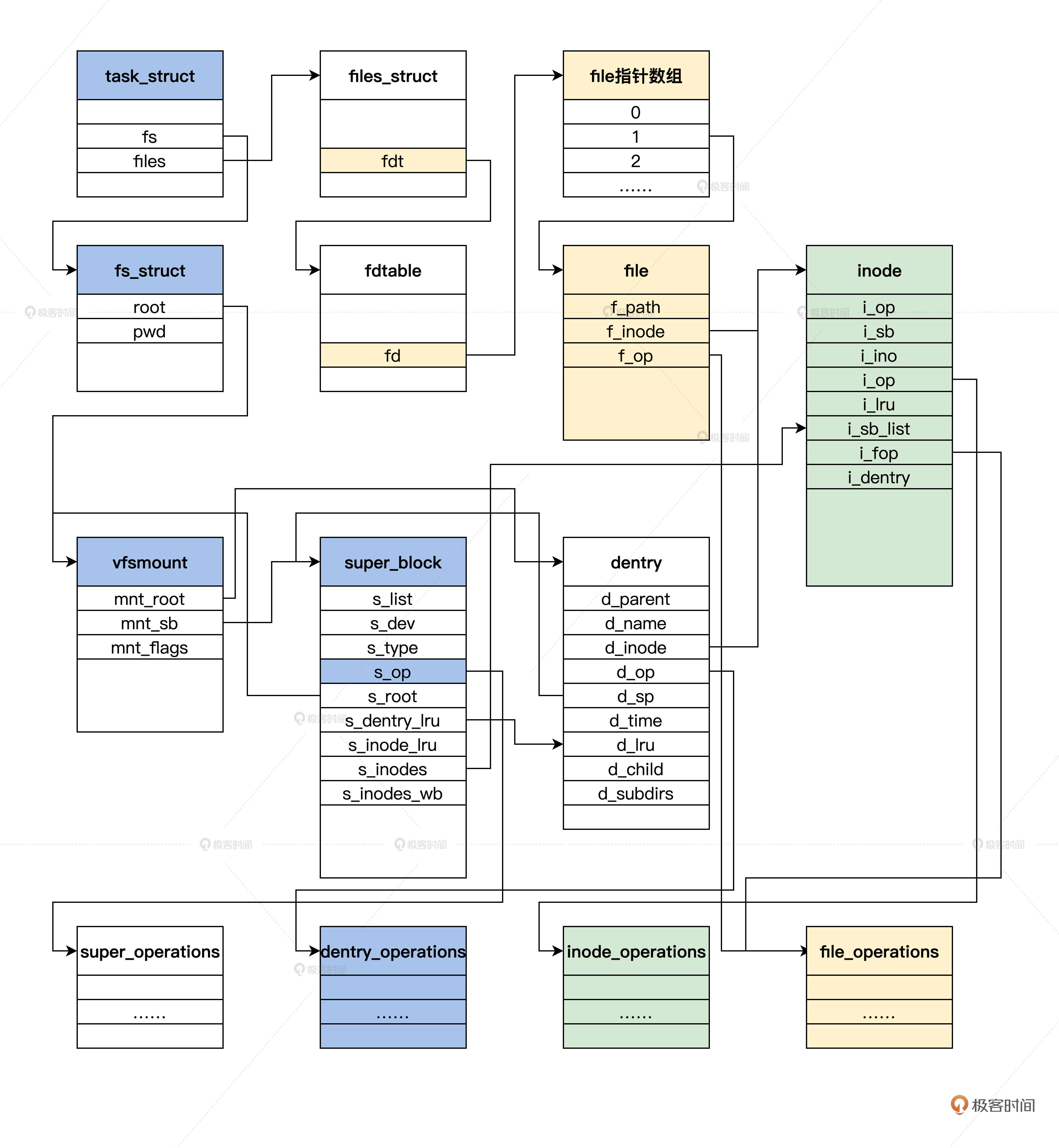 2.VFS的数据结构,为了搞清楚VFS的实现原理,我们研究了它的数据结构,分别是表示文件系统的超级块结构、表示文件路径的目录结构、表示文件自身的索引结点结构,还有进程打开的文件实例结构,最后还了解了它们之间的关系。