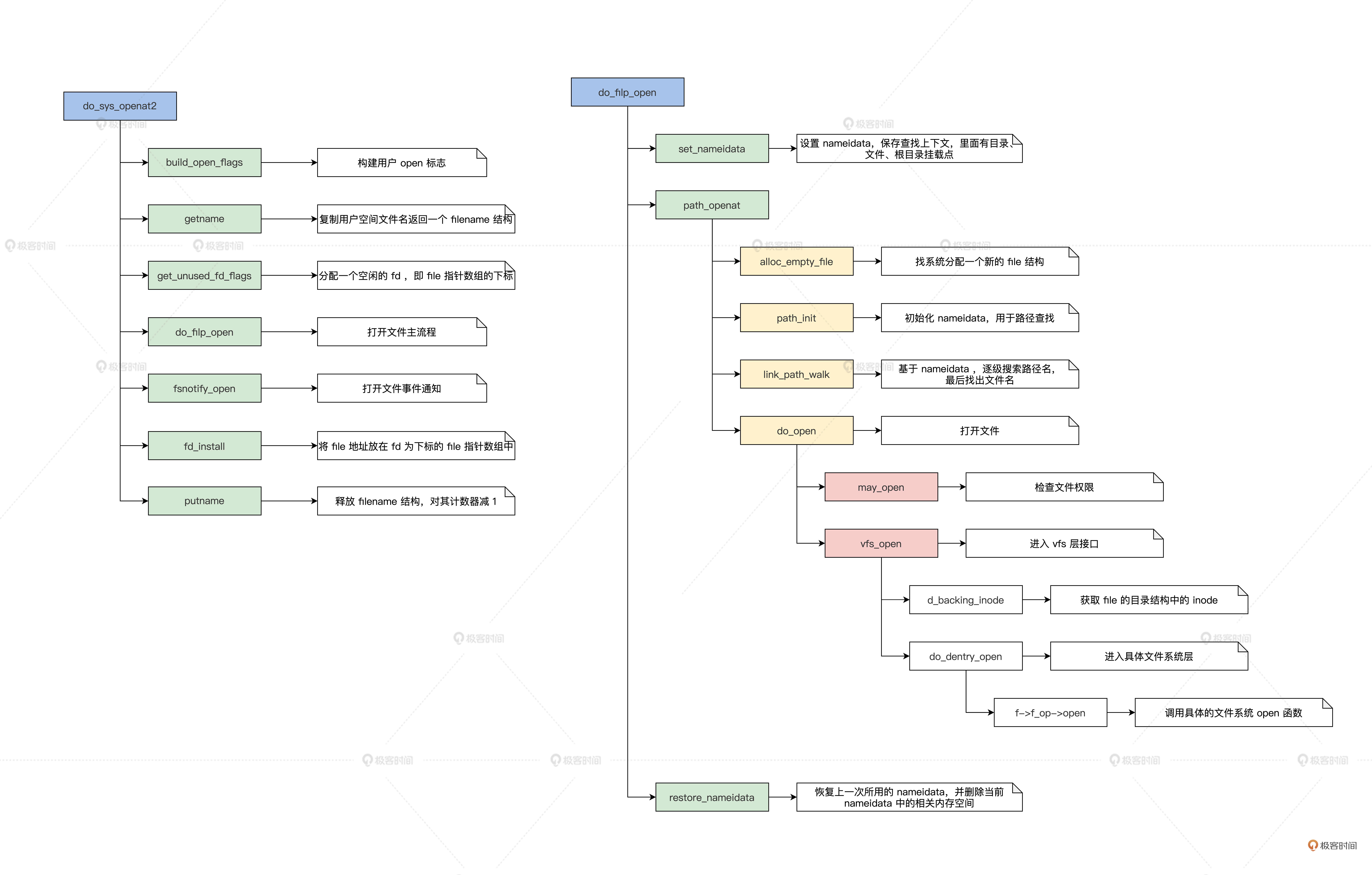 在x86_64架构里,open函数会执行syscall指令,从用户态转换到内核态,并且最终调用到do_sys_open函数,然进而调用do_sys_openat2函数。