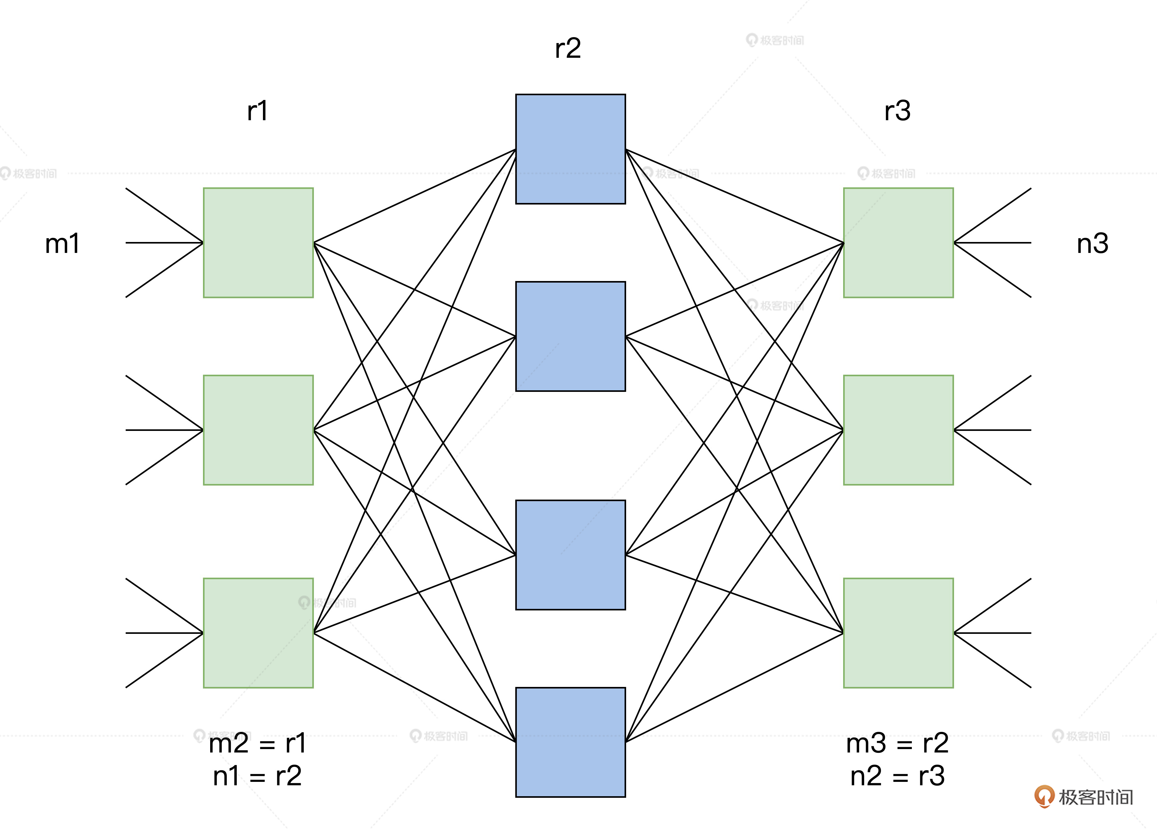下图中,m是每个子模块的输入端口数,n是每个子模块的输出端口数,r是每一级的子模块数,经过合理的重排,只要满足公式: