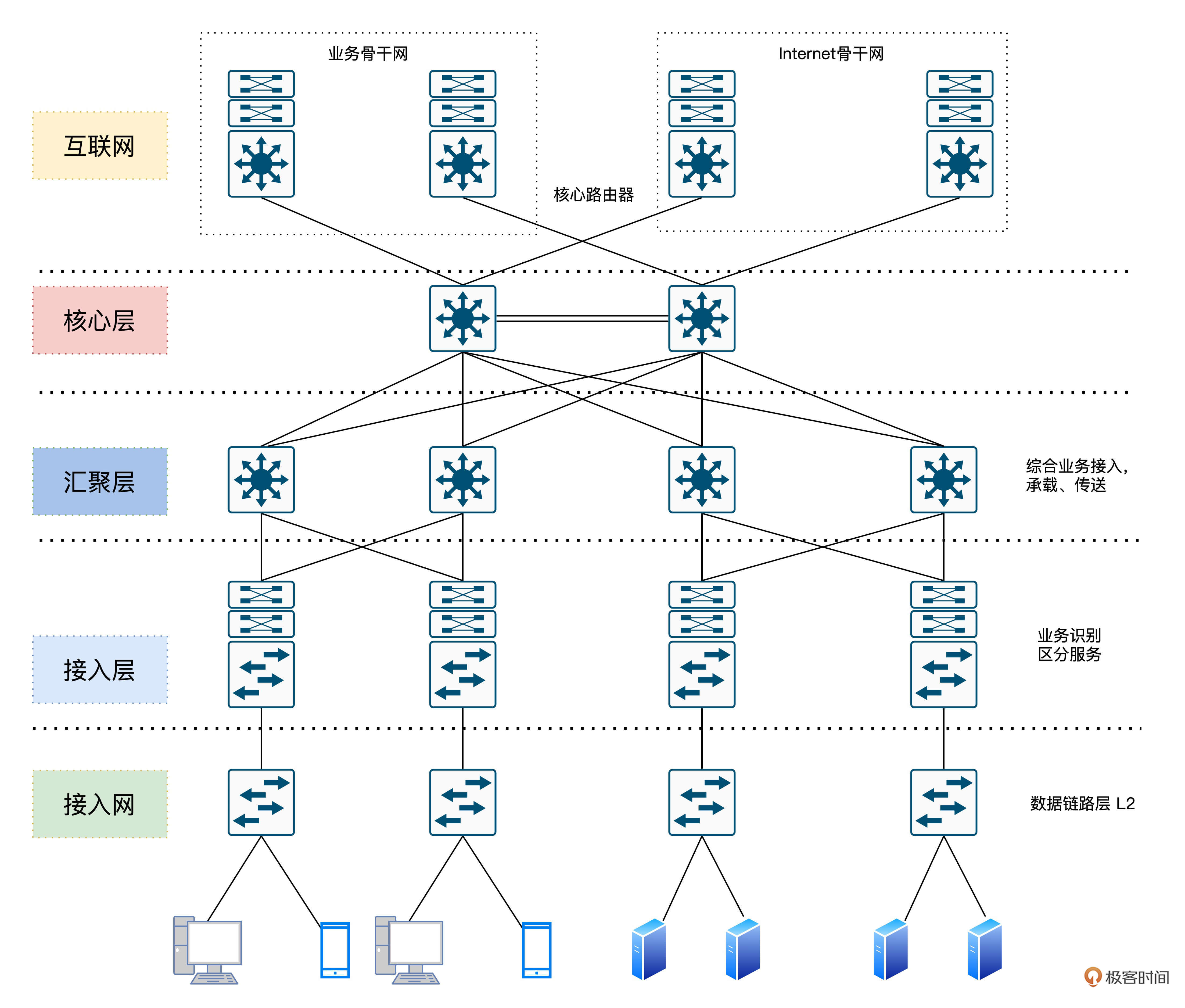 如下图所示,三层网络架构设计主要包括核心层、汇聚层、接入层这三个层。下面我分别给你说一说。