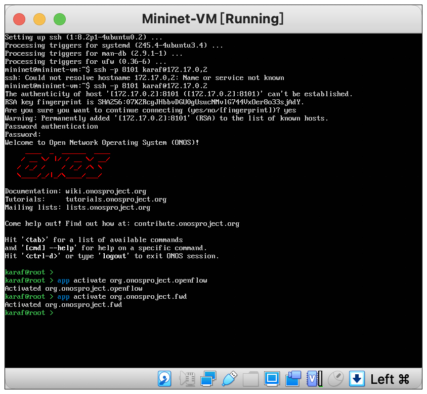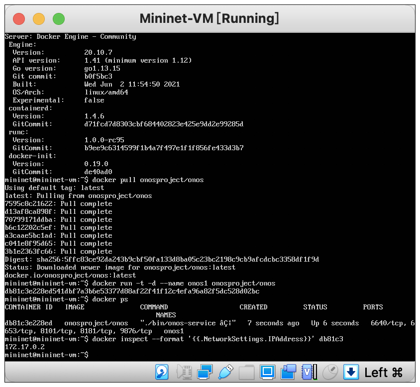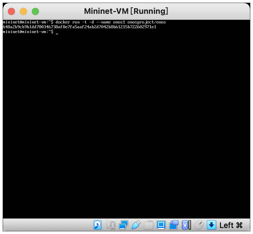 好,现在安装Mininet的工作就完成了。下面我们运行后面的docker run命令,创建ONOS容器。