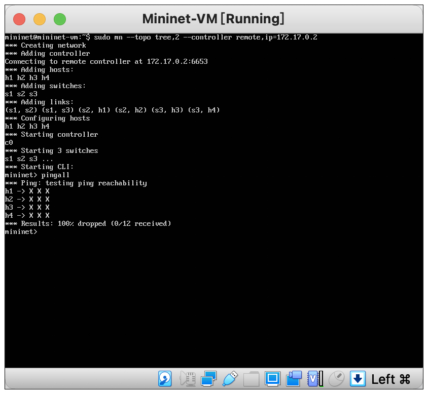 sudo mn --topo tree,2 --controller remote,ip=172.17.0.2 #创建临时网络