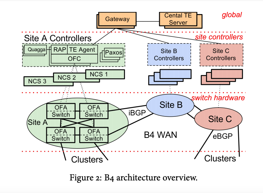 B4网络的其实也是由三层构成,但这个和传统网络的“三层架构”又不太一样。这里指的是物理设备层(Switch Hardware)、局部网络控制层(Site Controllers)和全局控制层(Global)。