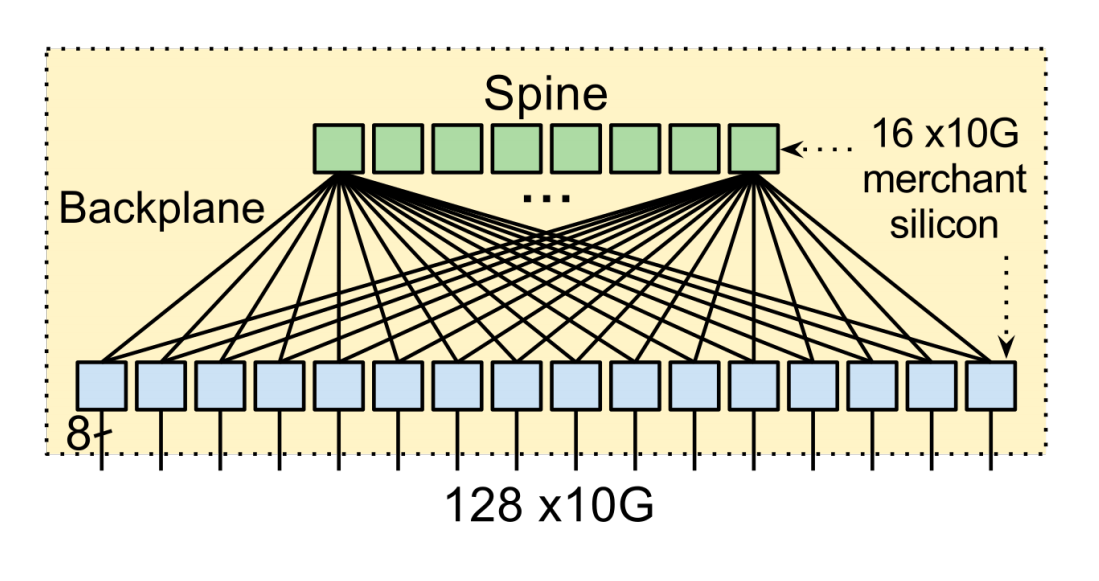我们首先来看第一层的物理交换设备,它是Google自研并请ODM厂商代工的白盒交换机。这个自研的交换机使用了24颗16×10Gb的芯片,还携带了128个10Gb网口。