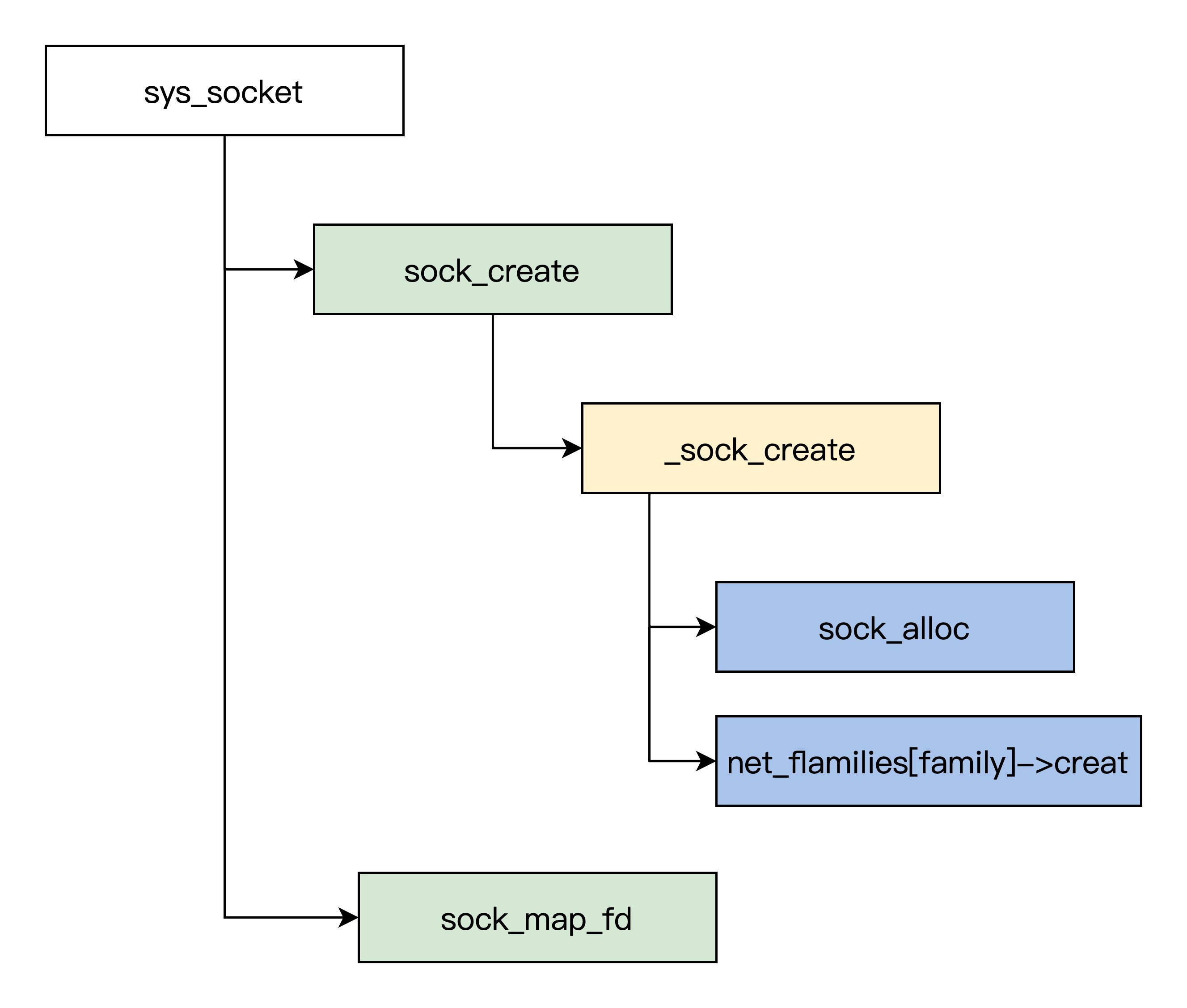 sock_create函数完成通用套接字创建、初始化任务后,再调用特定协议族的套接字创建函数。