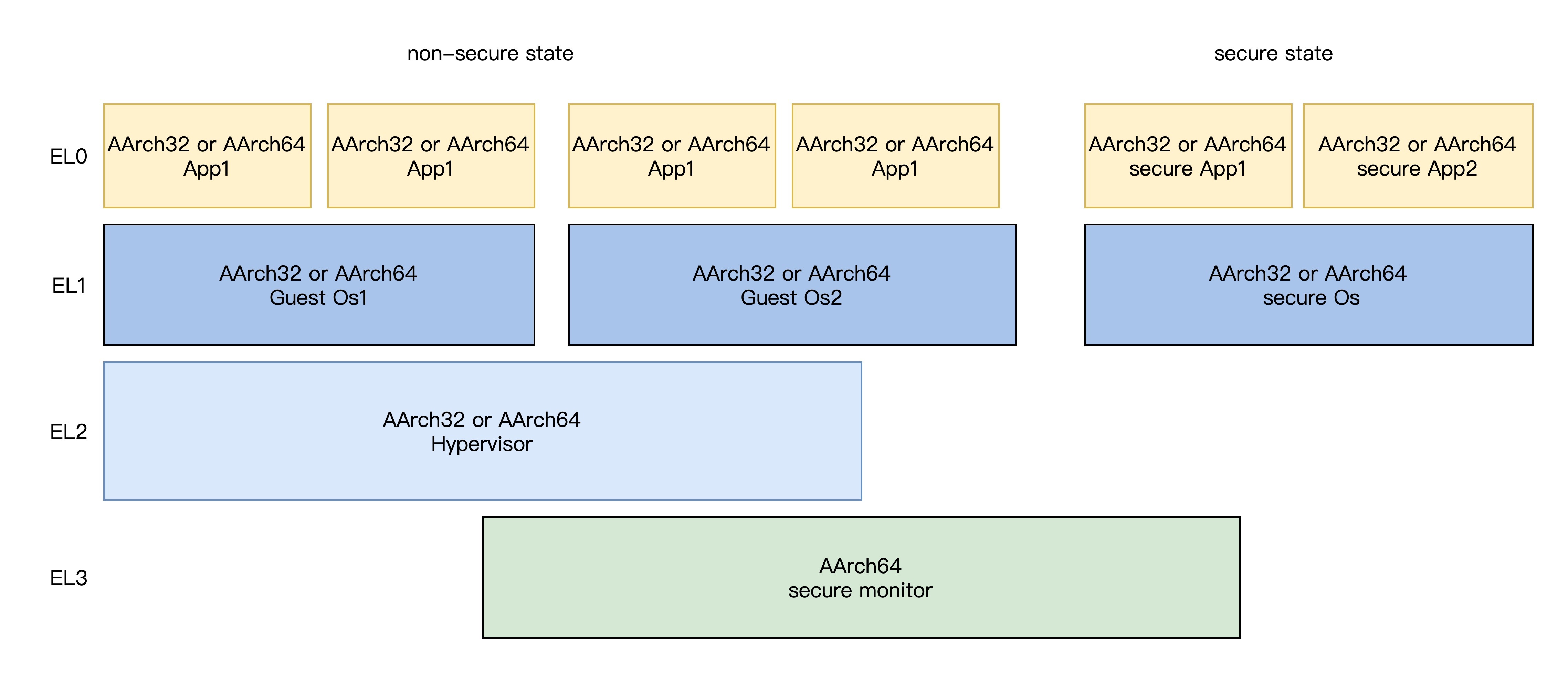 开发通用的操作系统内核只需要使用到EL1,EL2两个异常级别,我为你画了一幅EL模型图,如下所示。