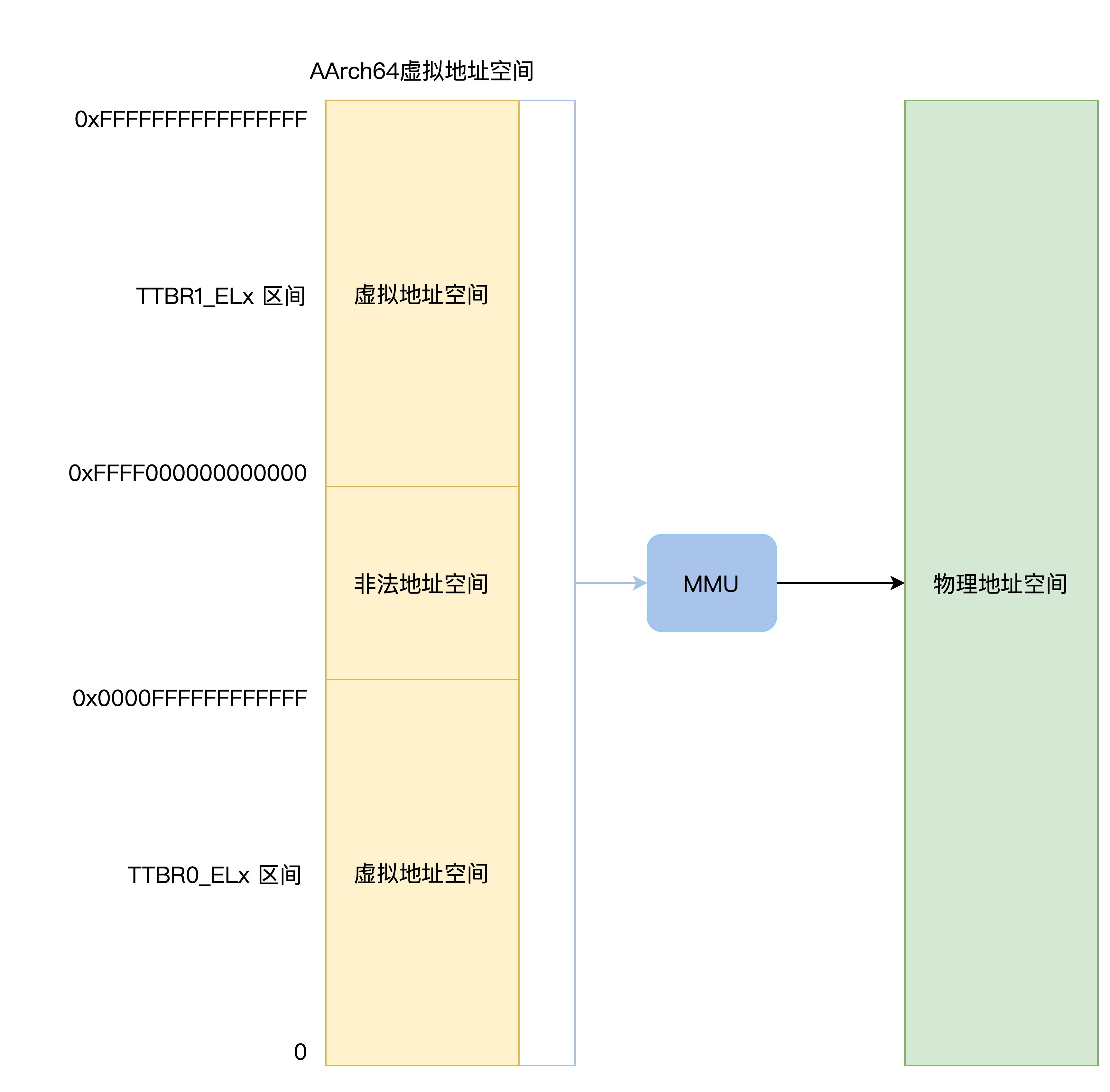 上图中可以发现,如果CPU发出的虚拟地址在0x0~0x0000ffffffffffff范围内,MMU就会使用TTBR0_ELx寄存器指向的地址转换表进行物理地址的转换;如果CPU发出的虚拟地址在0xffff000000000000~0xffffffffffffffff,MMU使用TTBR1_ELx寄存器指向的地址转换表进行物理地址的转换。