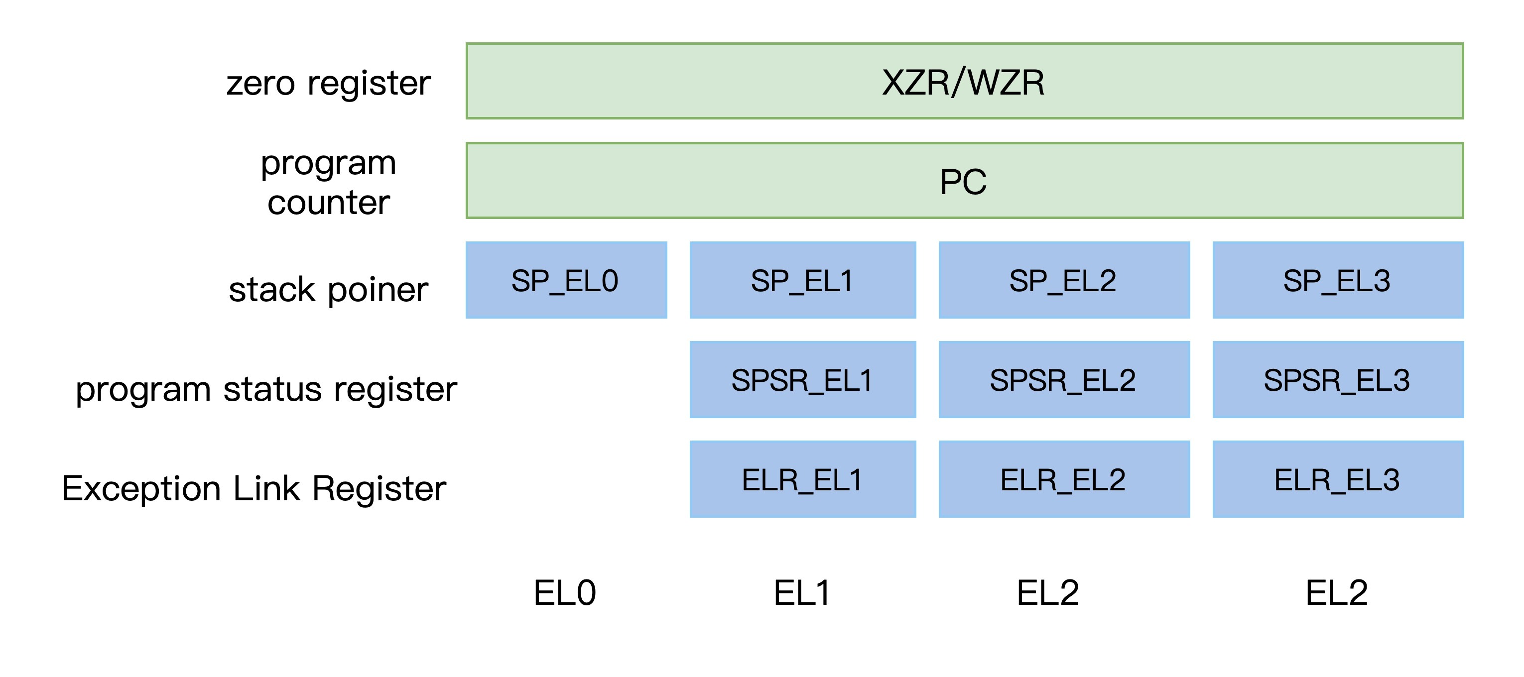 特殊寄存器(spseical registers)比通用寄存器稍微复杂一些,它还可以细分,包括程序计数寄存器(PC),栈指针寄存器(SP),异常链接寄存器(ELR_ELx),程序状态寄存器(PSTATE、SPSR_ELx)等。