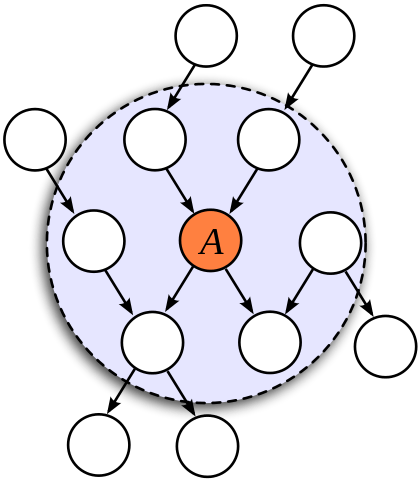 对贝叶斯网络中的结点应用变分贝叶斯推断时,只需要关注这个节点的马尔可夫毯,也就是它的父结点(parent)、子节点(child)以及共父结点(co-parent)。在计算结点\(H_j\)对应的低维概率分布\(Q^\*_j\)时,这些结点和\(H_j\)之间的条件概率都会作为变量出现,而不在马尔可夫毯中的其他结点的作用就体现为常数。