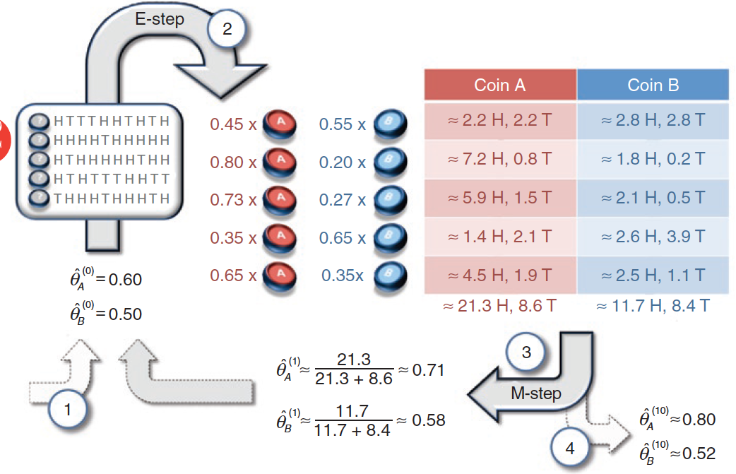既然硬币的选择已经确定,这时就可以使用最大似然估计,其结果和前文中的最大似然估计结果是相同的,也就是\(\\hat\\theta_A^{(1)} = 0.8, \\hat\\theta_B^{(1)} = 0.45\)。利用这组更新的参数又可以重新计算每一轮次抽取不同硬币的后验概率,你可以自己计算一下。