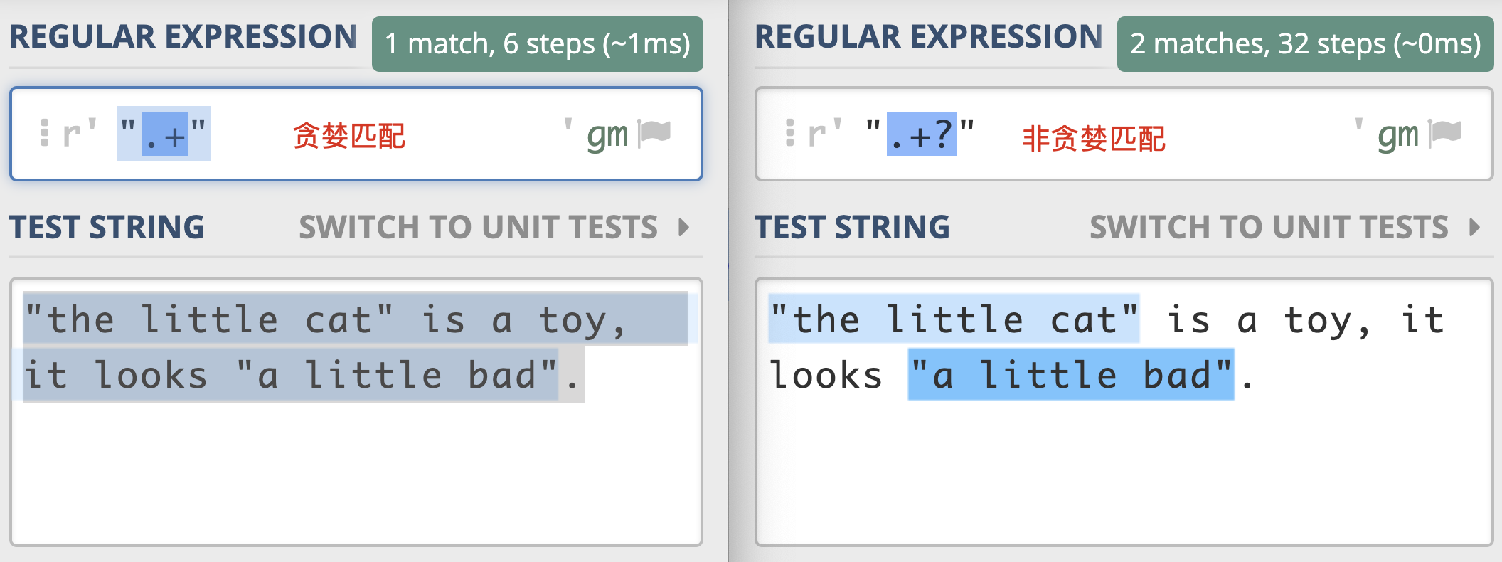 到这里你可能就明白了,非贪婪模式会尽可能短地去匹配,我把这两者之间的区别写到了下面这张图中。