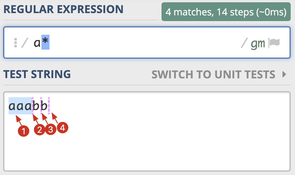 a* 在匹配开头的 a 时,会尝试尽量匹配更多的 a,直到第一个字母 b 不满足要求为止,匹配上三个a,后面每次匹配时都得到了空字符串。