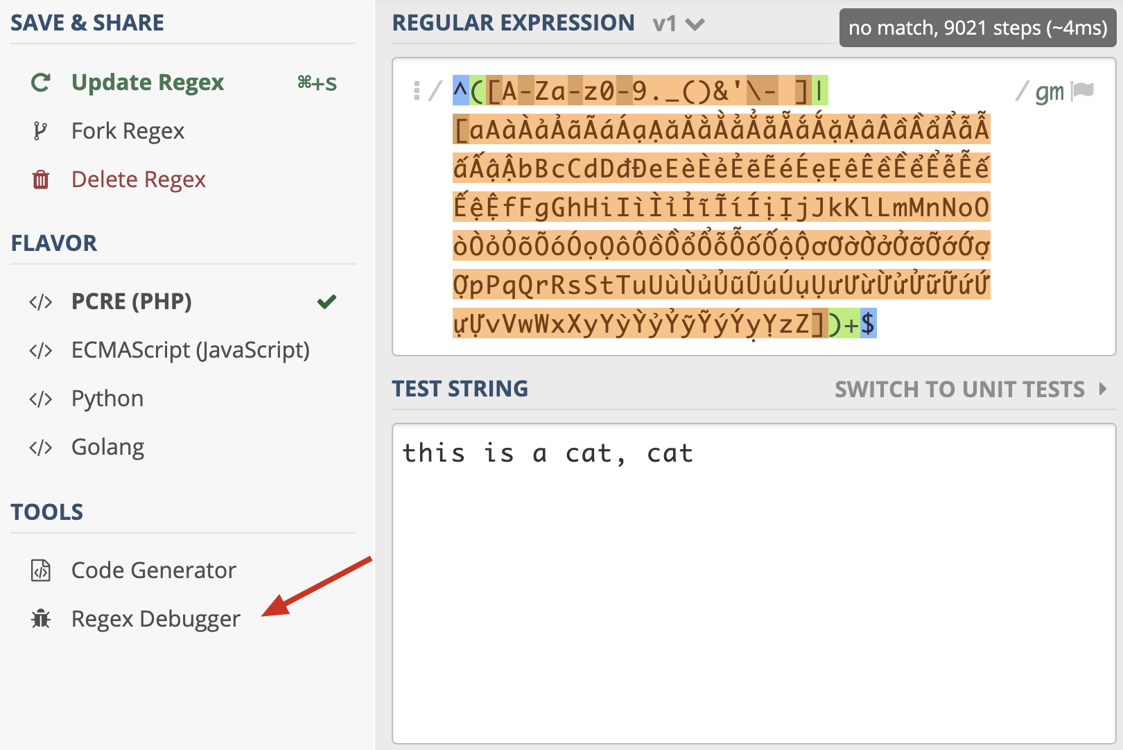 示例我们可以看到,一个很短的字符串,NFA引擎尝试步骤达到了 9021 次,由于是贪婪匹配,第一个分支能匹配上 this is a cat 部分,接着后面的逗号匹配失败,使用第二个分支匹配,再次失败,此时贪婪匹配部分结束。NFA引擎接着用正则后面的 $ 来进行匹配,但此处不是文本结尾,匹配不上,发生回溯,吐出第一个分支匹配上的 t,使用第二个分支匹配 t 再试,还是匹配不上。