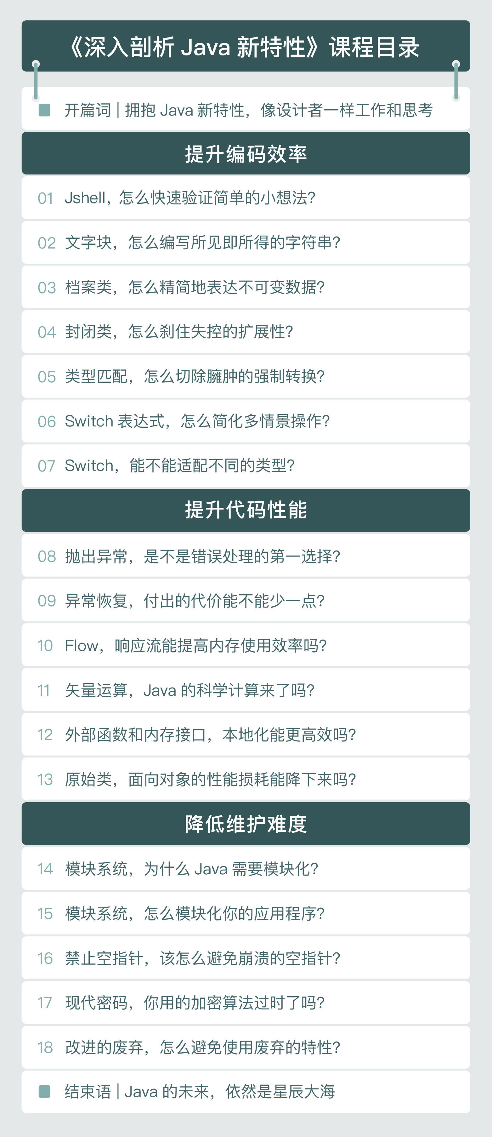 在这门课程里,我从JDK 9到JDK 17的新特性中筛选出了最核心、有用的18条特性。我会分三个模块给你讲解一般软件工程师需要经常使用的Java语言新技能。
