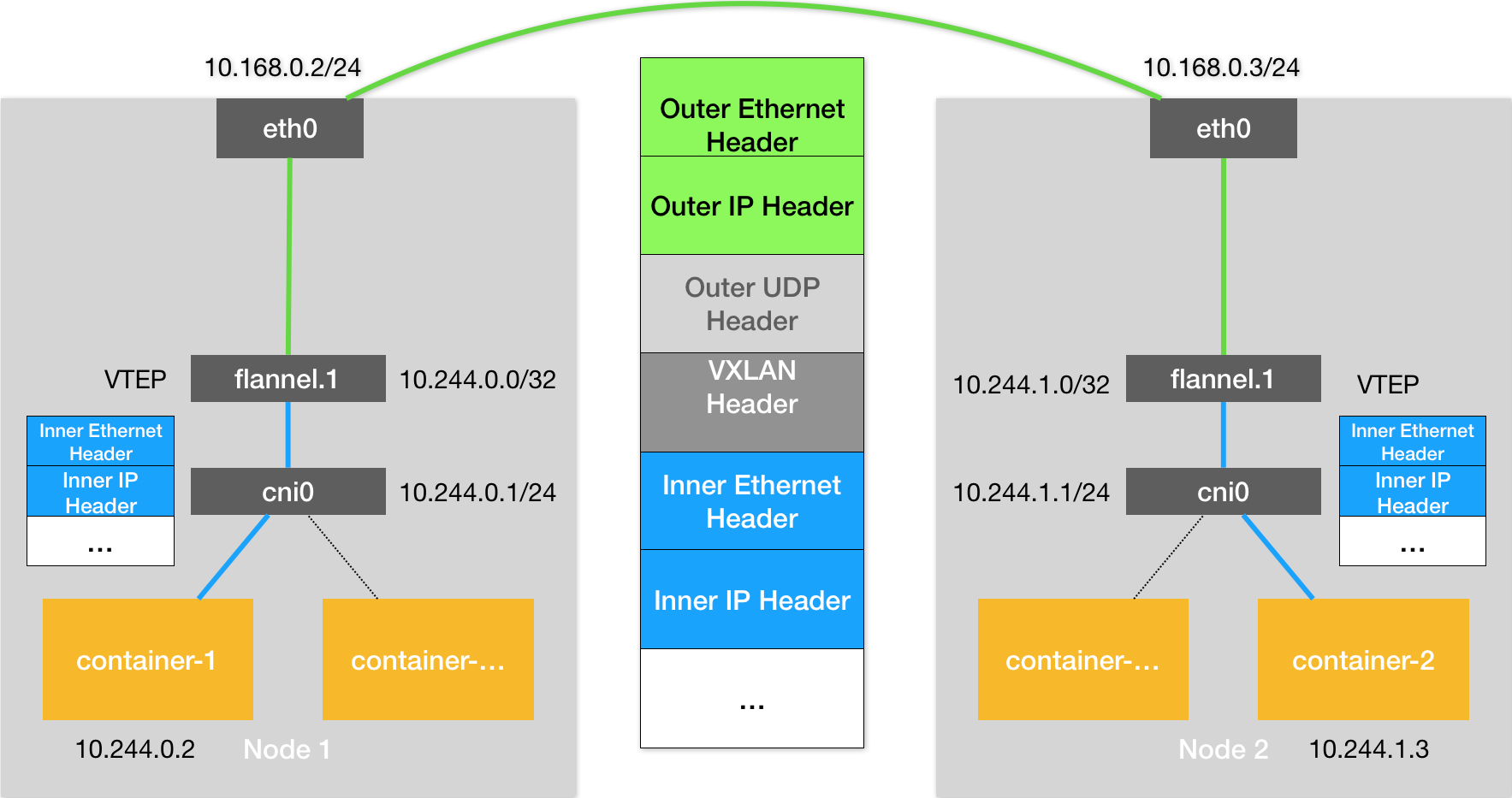 可以看到,这条规则指定了本机的flannel.1设备进行处理。并且,flannel.1在处理完后,要将IP包转发到的网关(Gateway),正是“隧道”另一端的VTEP设备,也就是Node 2的flannel.1设备。所以,接下来的流程,就跟上一篇文章中介绍过的Flannel VXLAN模式完全一样了。