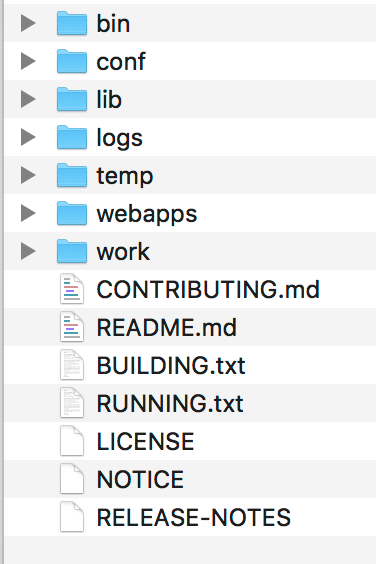最新版本的Tomcat可以直接在官网上下载,根据你的操作系统下载相应的版本,这里我使用的是Mac系统,下载完成后直接解压,解压后的目录结构如下。