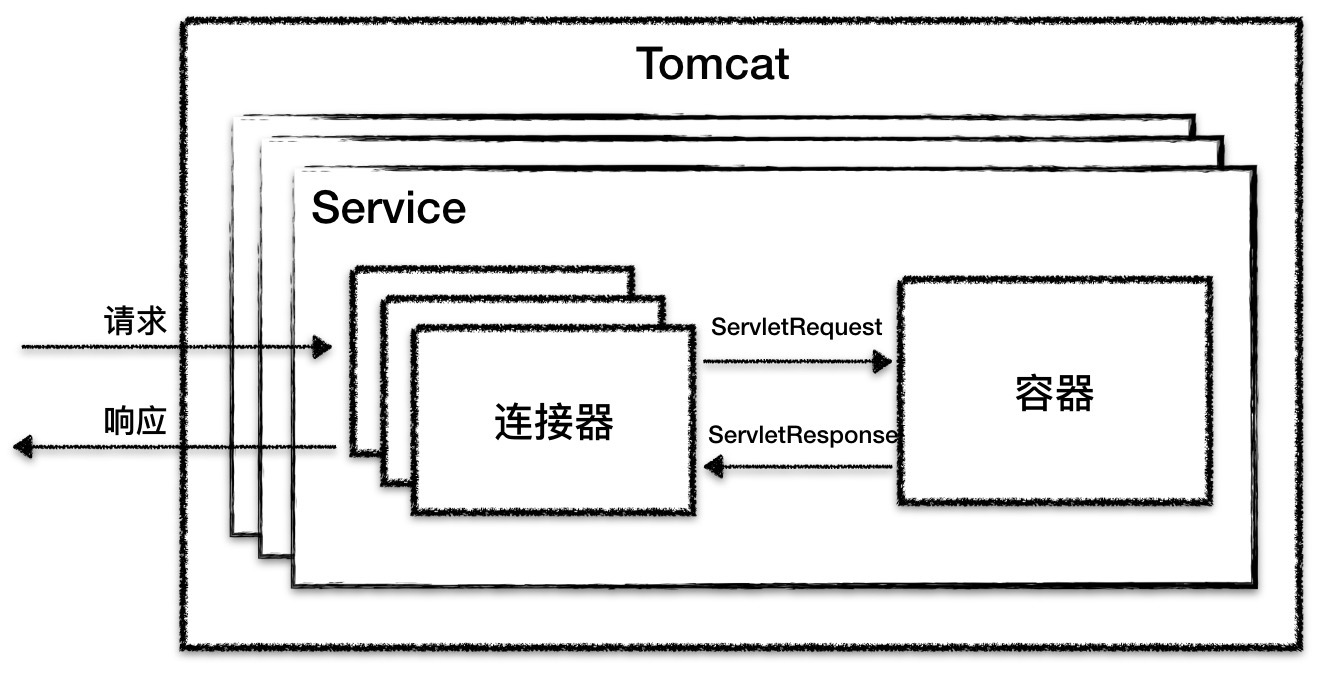 我们对比一下Tomcat的整体架构图,你会发现Tomcat在整体上跟Jetty很相似,它们的第一个区别是Jetty中没有Service的概念,Tomcat中的Service包装了多个连接器和一个容器组件,一个Tomcat实例可以配置多个Service,不同的Service通过不同的连接器监听不同的端口;而Jetty中Connector是被所有Handler共享的。