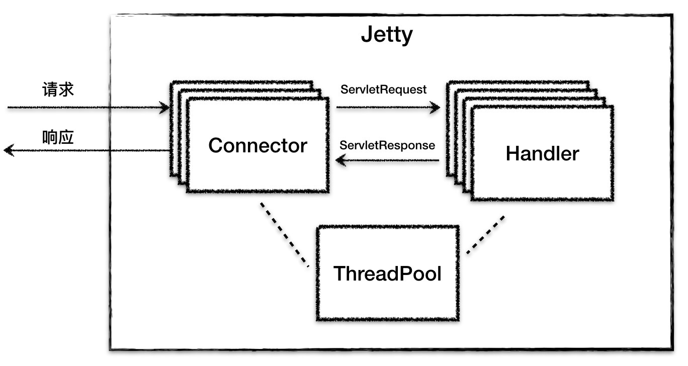 Jetty Server就是由多个Connector、多个Handler,以及一个线程池组成,在设计上简洁明了。