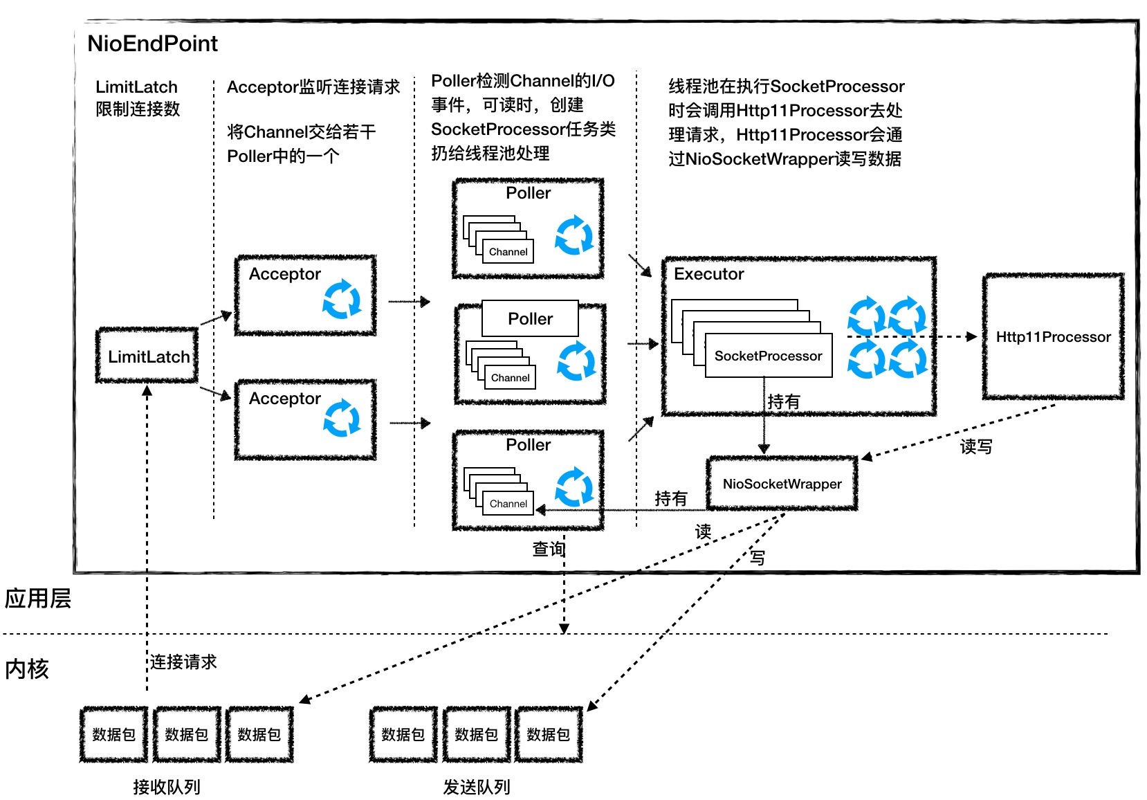 Executor就是线程池,负责运行SocketProcessor任务类,SocketProcessor的run方法会调用Http11Processor来读取和解析请求数据。我们知道,Http11Processor是应用层协议的封装,它会调用容器获得响应,再把响应通过Channel写出。