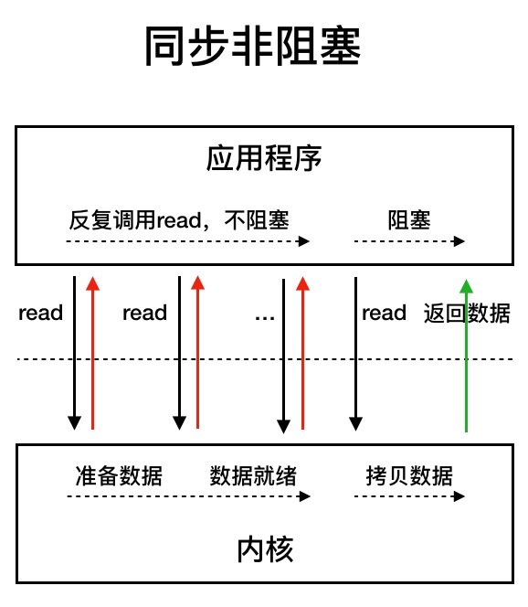 同步非阻塞I/O:用户线程不断的发起read调用,数据没到内核空间时,每次都返回失败,直到数据到了内核空间,这一次read调用后,在等待数据从内核空间拷贝到用户空间这段时间里,线程还是阻塞的,等数据到了用户空间再把线程叫醒。