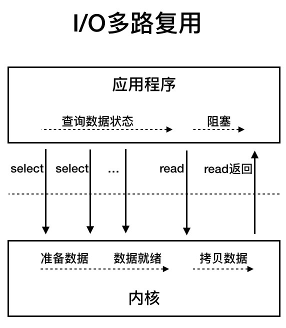 I/O多路复用:用户线程的读取操作分成两步了,线程先发起select调用,目的是问内核数据准备好了吗?等内核把数据准备好了,用户线程再发起read调用。在等待数据从内核空间拷贝到用户空间这段时间里,线程还是阻塞的。那为什么叫I/O多路复用呢?因为一次select调用可以向内核查多个数据通道(Channel)的状态,所以叫多路复用。
