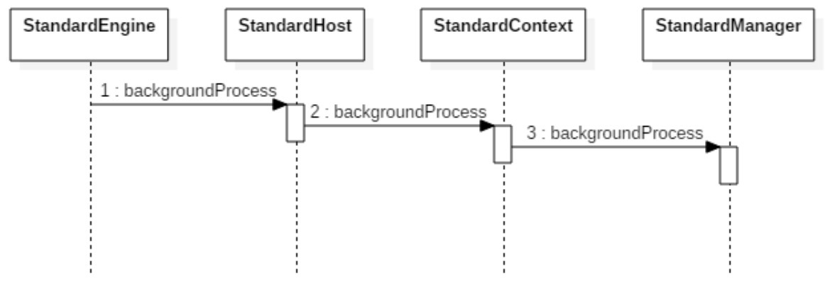 我们再来看看Tomcat是如何清理过期的Session。在Tomcat热加载和热部署的文章里,我讲到容器组件会开启一个ContainerBackgroundProcessor后台线程,调用自己以及子容器的backgroundProcess进行一些后台逻辑的处理,和Lifecycle一样,这个动作也是具有传递性的,也就是说子容器还会把这个动作传递给自己的子容器。你可以参考下图来理解这个过程。
