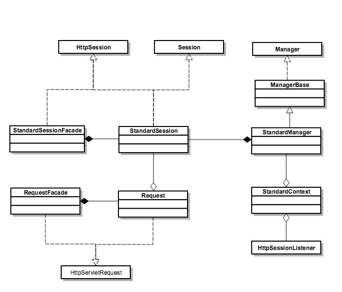 Servlet规范中定义了HttpServletRequest和HttpSession接口,Tomcat实现了这些接口,但具体实现细节并没有暴露给开发者,因此定义了两个包装类,RequestFacade和StandardSessionFacade。