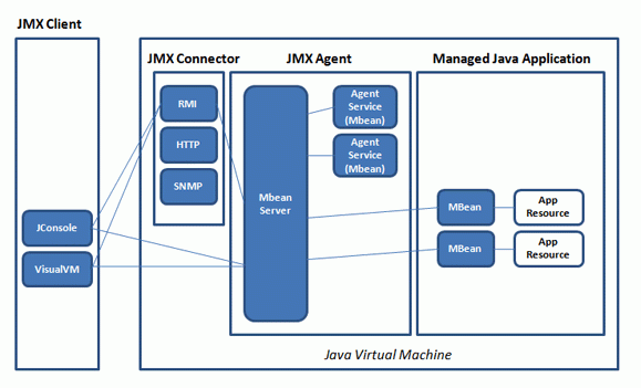 那如何监控这些指标呢?Tomcat可以通过JMX将上述指标暴露出来的。JMX(Java Management Extensions,即Java管理扩展)是一个为应用程序、设备、系统等植入监控管理功能的框架。JMX使用管理MBean来监控业务资源,这些MBean在JMX MBean服务器上注册,代表JVM中运行的应用程序或服务。每个MBean都有一个属性列表。JMX客户端可以连接到MBean Server来读写MBean的属性值。你可以通过下面这张图来理解一下JMX的工作原理: