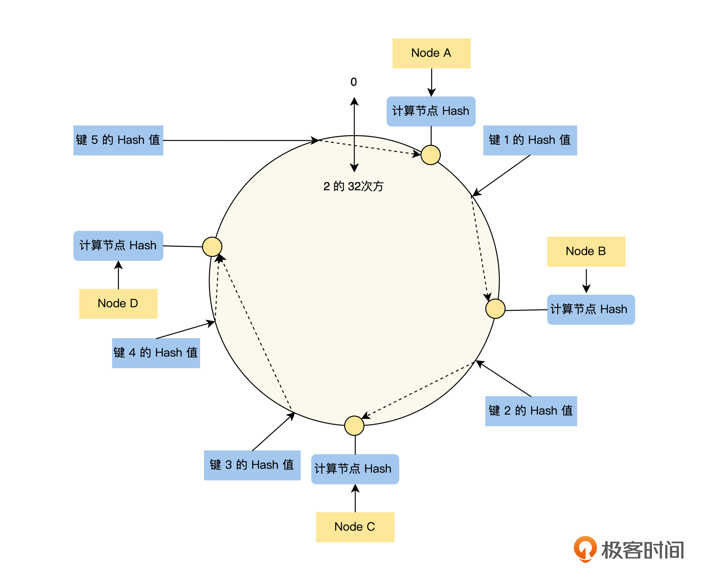 假设我们定义 Hash 环的空间大小为\(2^{32}\),那么我们先将 0 ~ \(2^{32}\)均匀地分配到上图的 Hash 环上,将所有的实例按其唯一标识(例如名字的字符串 “ Node A ”)计算在环上的位置: