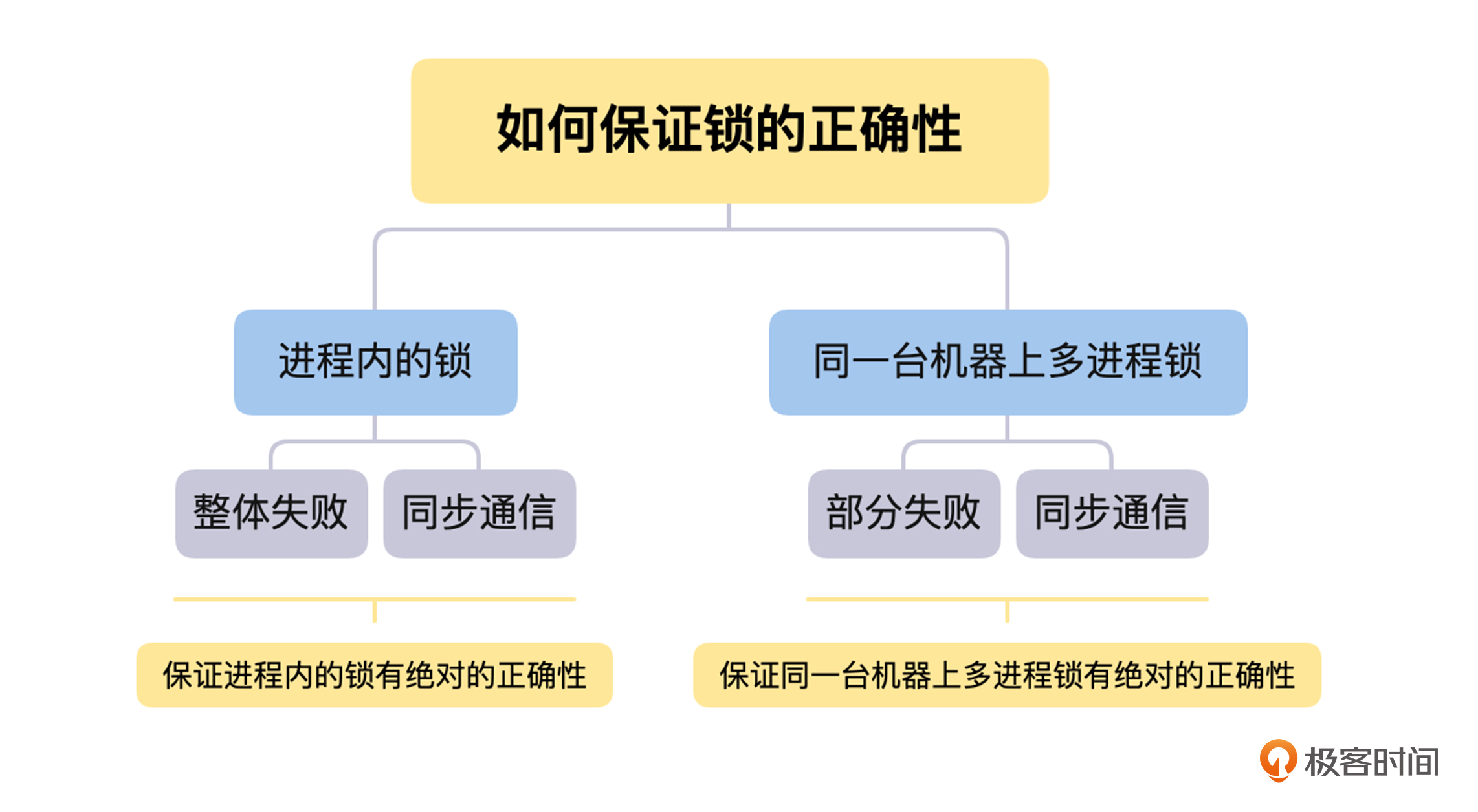 另一个方面,进程内锁的解锁操作是进程内部的函数调用,这个过程是同步的。不论是硬件或者其他方面的原因,只要发起解锁操作就一定会成功,如果出现失败的情况,整个进程或者机器都会挂掉。所以,因为整体失败和同步通信这两点,我们可以保证进程内的锁有绝对的正确性