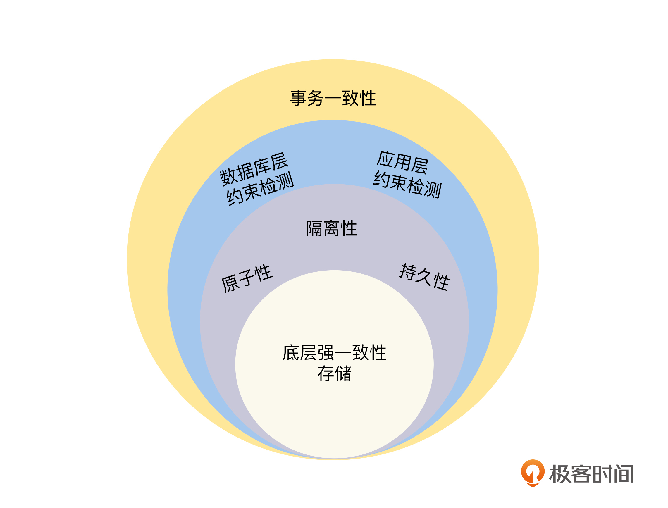 另一个是应用层的业务逻辑,它需要结合业务场景做一些约束检测,这样做是为了保障数据的一致性,比如用户课程购买的场景,从用户账号扣掉的钱,应该和收款方的数目是相等的。如果应用层的处理逻辑出现 Bug,导致用户账号扣掉的钱比收款方的多,这样的一致性问题在数据库的事务层面是无法约束检测的,它需要应用层的业务逻辑来保证。