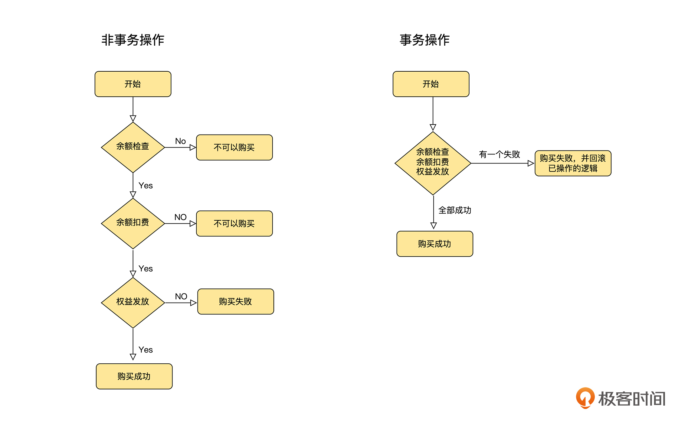 我们仔细分析就会发现,这个问题的根本原因是余额扣费和权益发放不是一个整体操作,出现了部分执行成功的情况。这里可以结合事务来思考,如果将课程购买通过一个事务来执行的话,这个事务就会包括余额检查、余额扣费和权益发放 3 个操作,并且它对这个组合操作提供了一个保证,保证不论出现什么故障,这 3 个操作要么都执行成功,要么都不执行。所以当我们结合事务来思考,如下图所示,这个问题就迎刃而解了。
