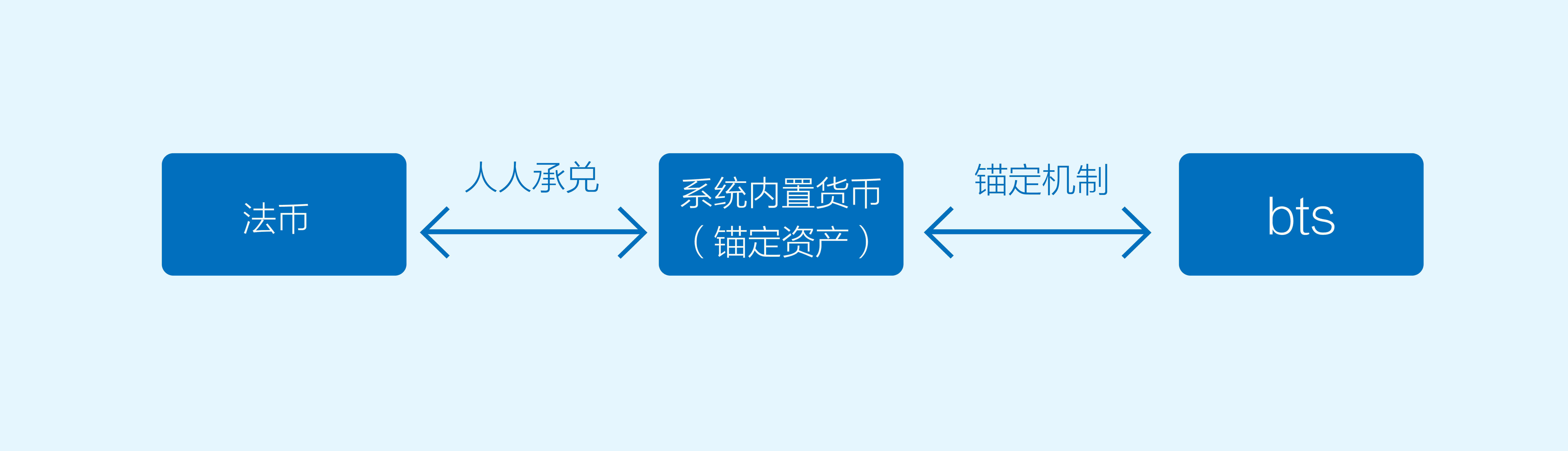 这个过程可以简述为:法币<—>锚定资产(系统内置货币)<—>bts 的相互转换。从法币到系统内置货币用到了人人承兑机制,从系统内置货币到bts的转换用到了锚定机制。