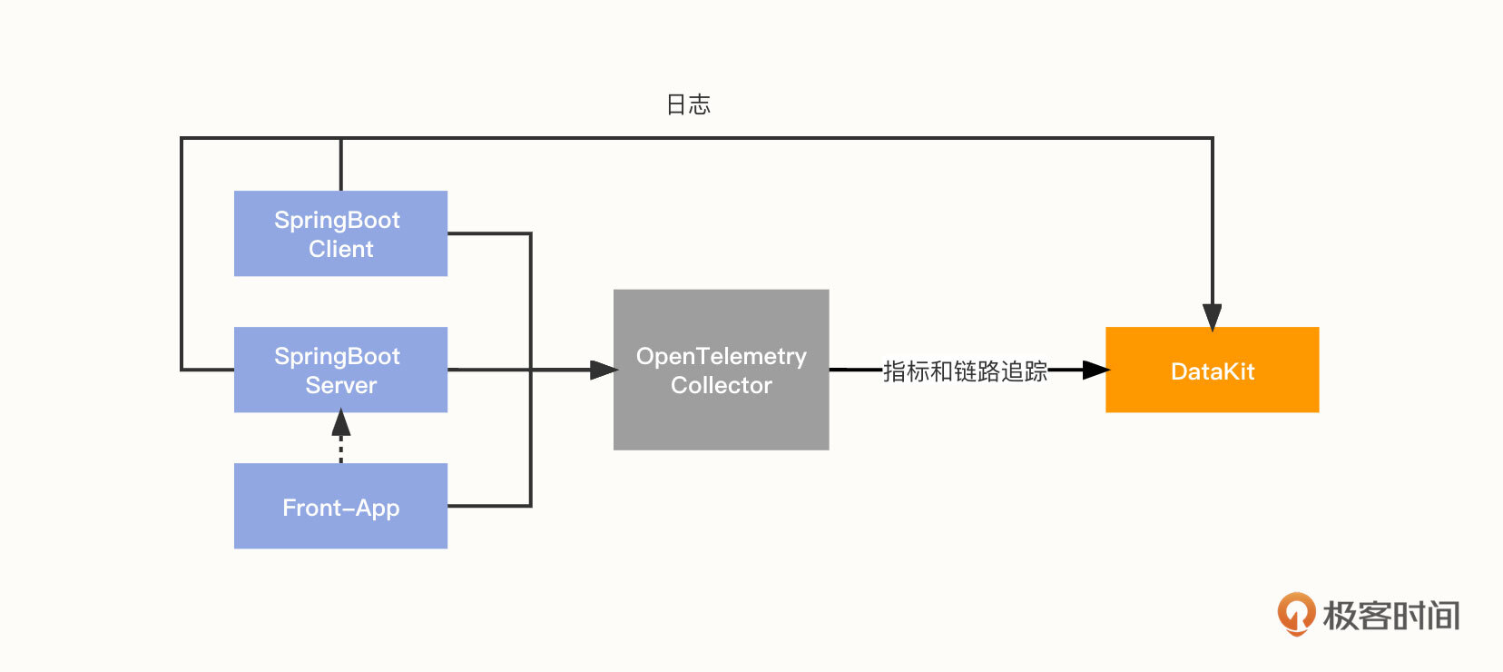 我们以一个 SpringBoot 应用为例,解读一下数据采集和传输的过程: