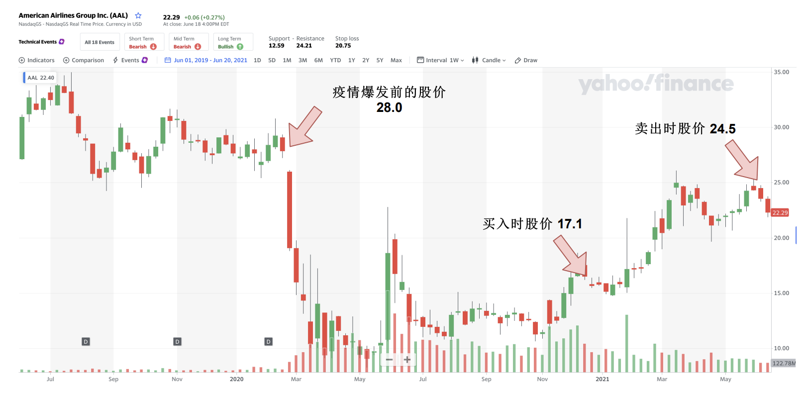 我当时的判断是这样的:如果疫苗成功阻击疫情,那么航空股必然会有相应的反弹;如果疫苗效果不好,情况也不会比现在更糟,投资的损失也不会过大。那么基于这样的投资支点,我在2021年的元旦前后以17.1的价格买入美国航空。