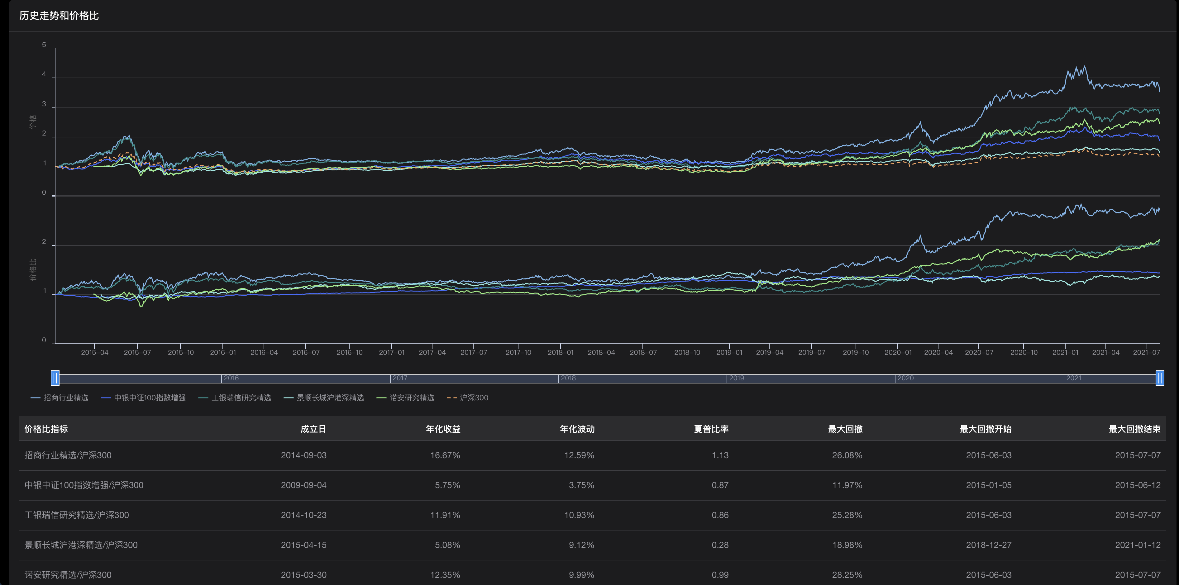 可以看出,景顺长城沪港深精选的价格波动较大,长期向上趋势也弱于其他几只,说明它不是我们要找的合适工具,可以首先被剔除出去。剩下几只基金中,具体挑哪一只基金,还是要根据你的风险偏好来决定。举个例子,如果你的风险偏好非常保守,那当然应该选择价格比走势最平稳的“中银中证100增强”;如果你追求高收益,可以忍受比较大的中途回撤,那么走势最好,但波动较大的“招商行业精选”就更适合你。